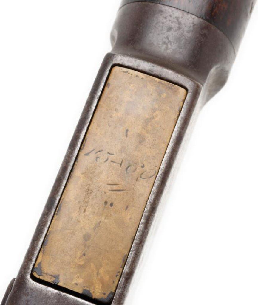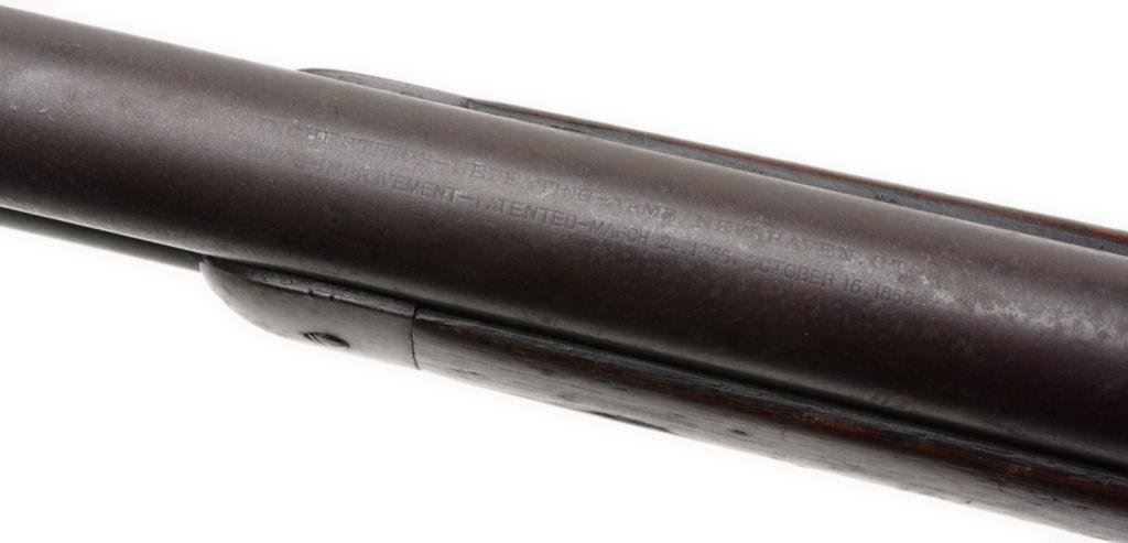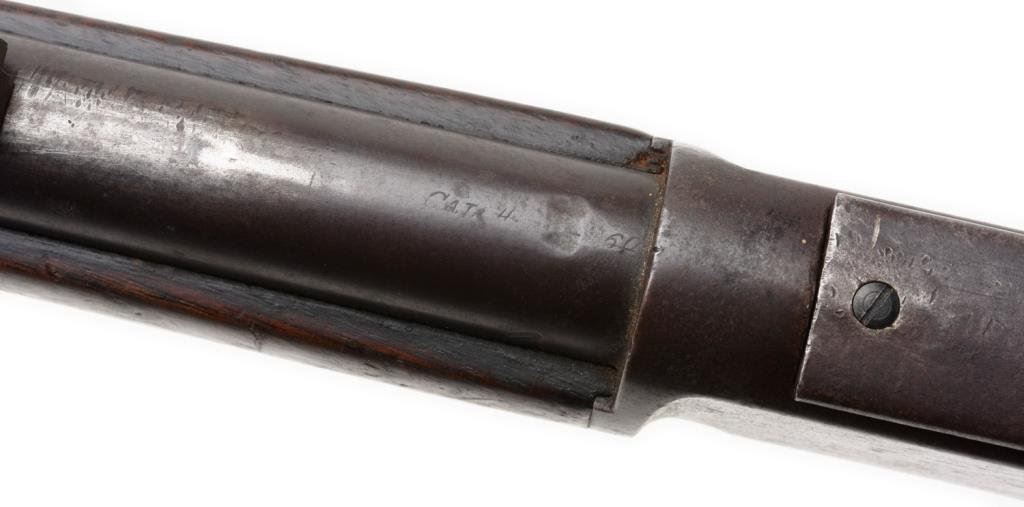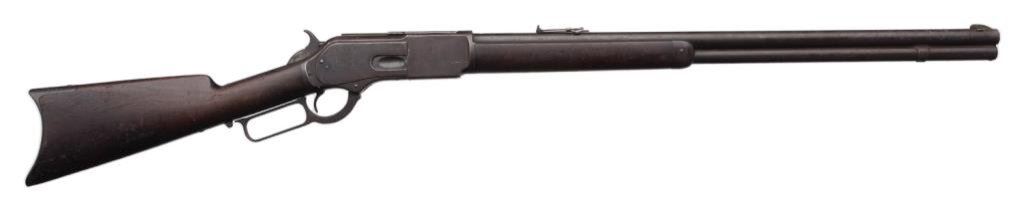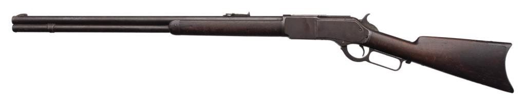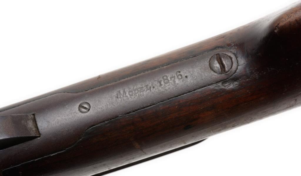Winchester Model 1876 lever action rifle, .45-60 caliber, 26” round barrel, S/N 18022, 2nd type dust cover rail, blued finish, wood stocks in overall good to very good un-cleaned condition showing a heavy dark patina to metal surfaces with scattered areas of original blue primarily on the receiver, some scattered spots of erosion and light surface rust; good action, markings and good to very good wood stocks with scattered old mars and scratches from carry and storage. The bore is fair + and may clean to good. Accompanied by an original factory letter confirming features and indicating receipt at warehouse on October 6, 1881; shipment from warehouse on October 7, 1881 to order number 28661. Est.: $2,500-$5,000.