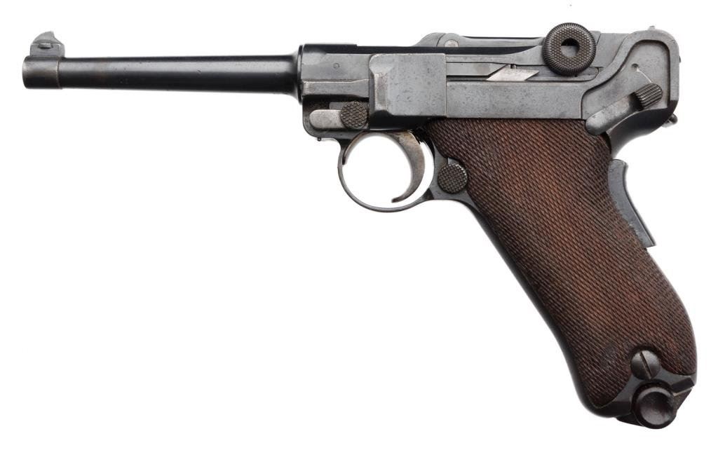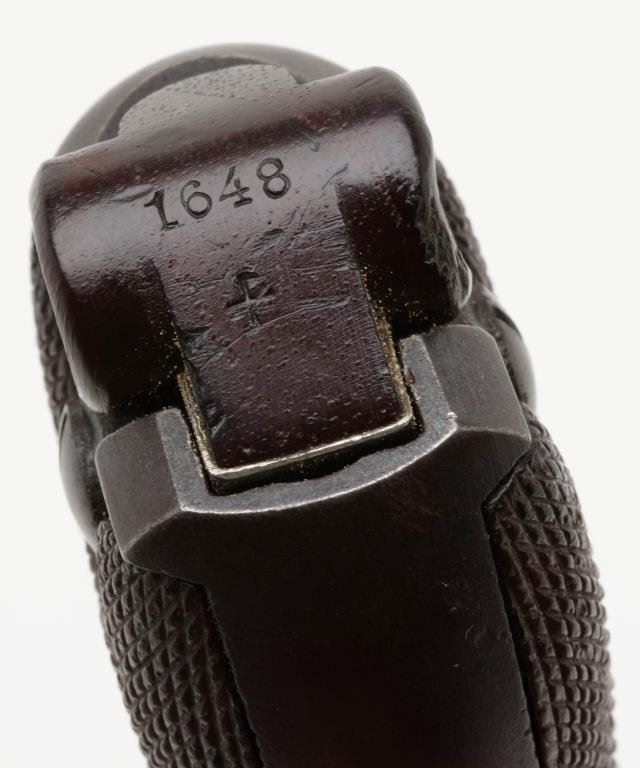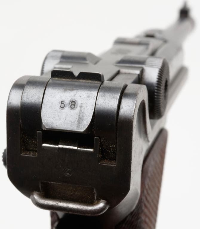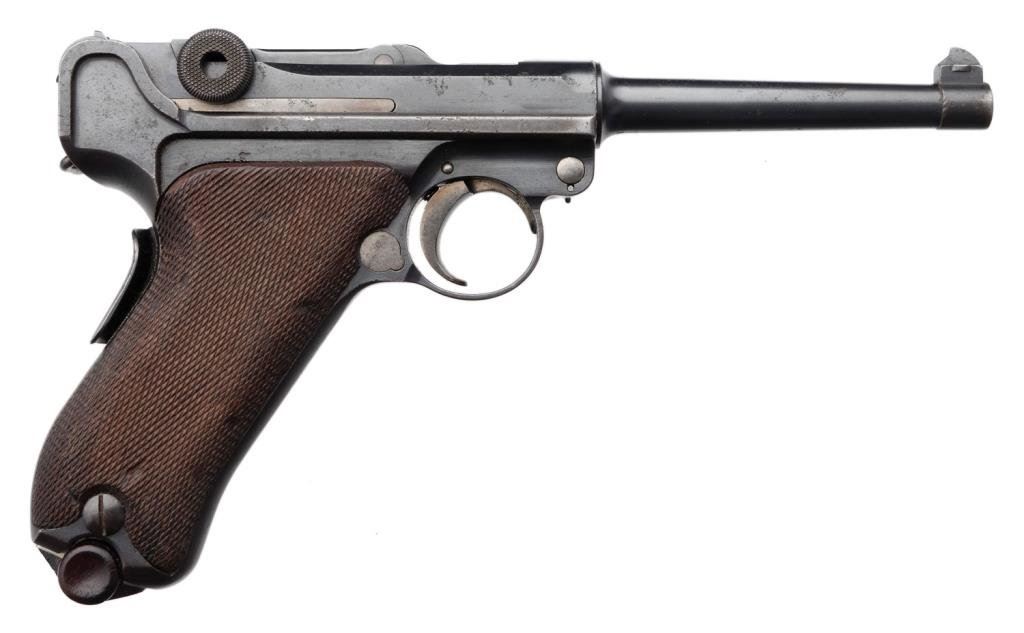 **Portugese Luger semi-automatic pistol by DWM, Manuel 2 cypher on breech, .30 caliber, 4.5” barrel, S/N 958, good bore, considerable military blue finish remaining, wood based magazine #1648; grip safety and checkered wood grips. An honest and scarce variation of the 1906 Model. Est.: $1,400-$2,800.