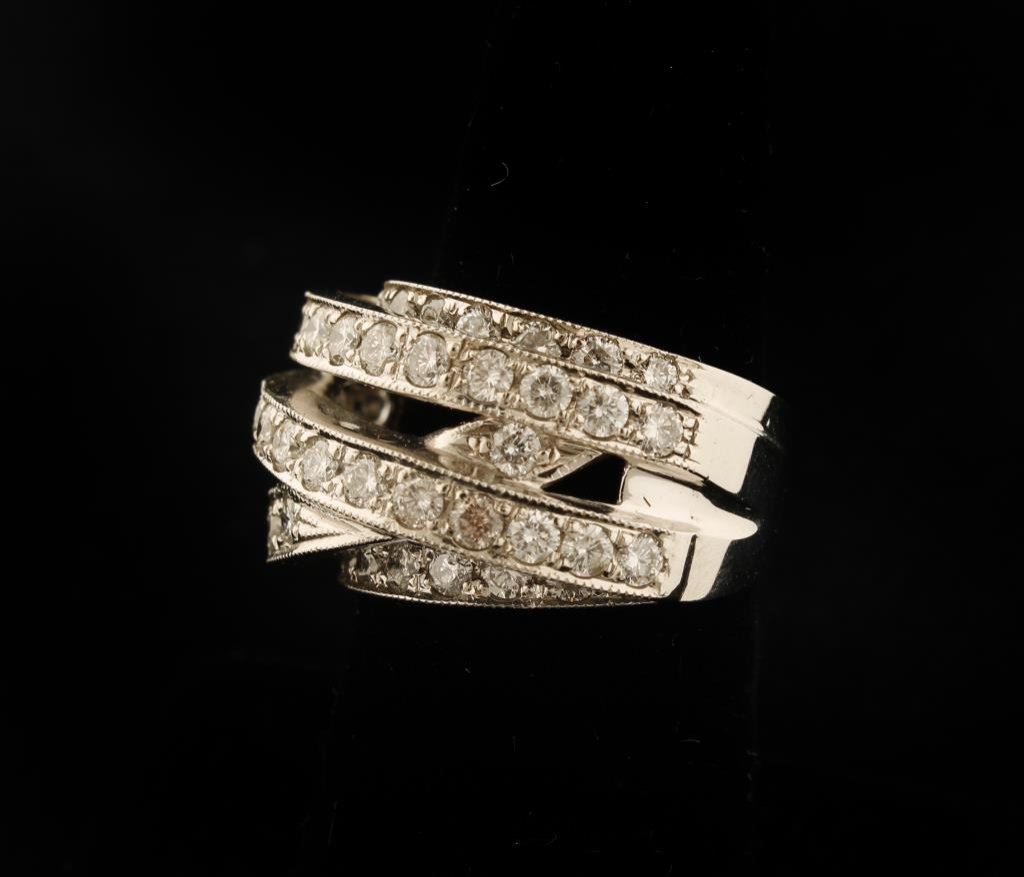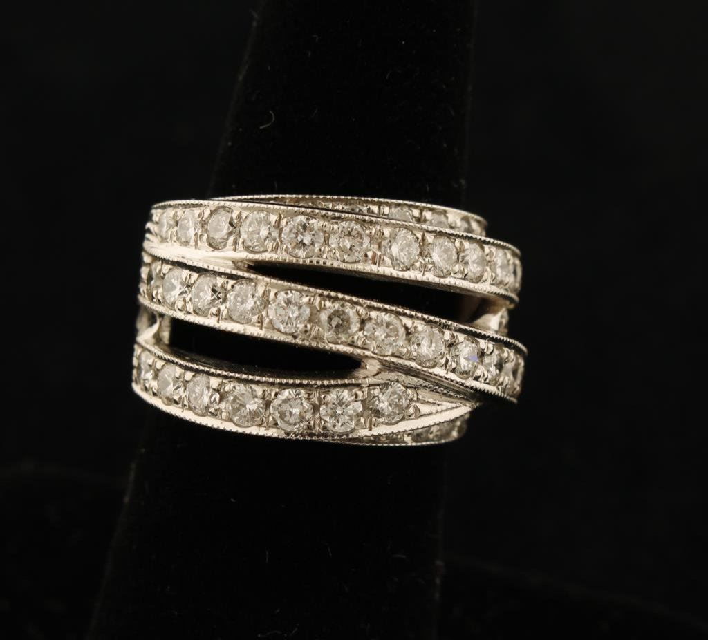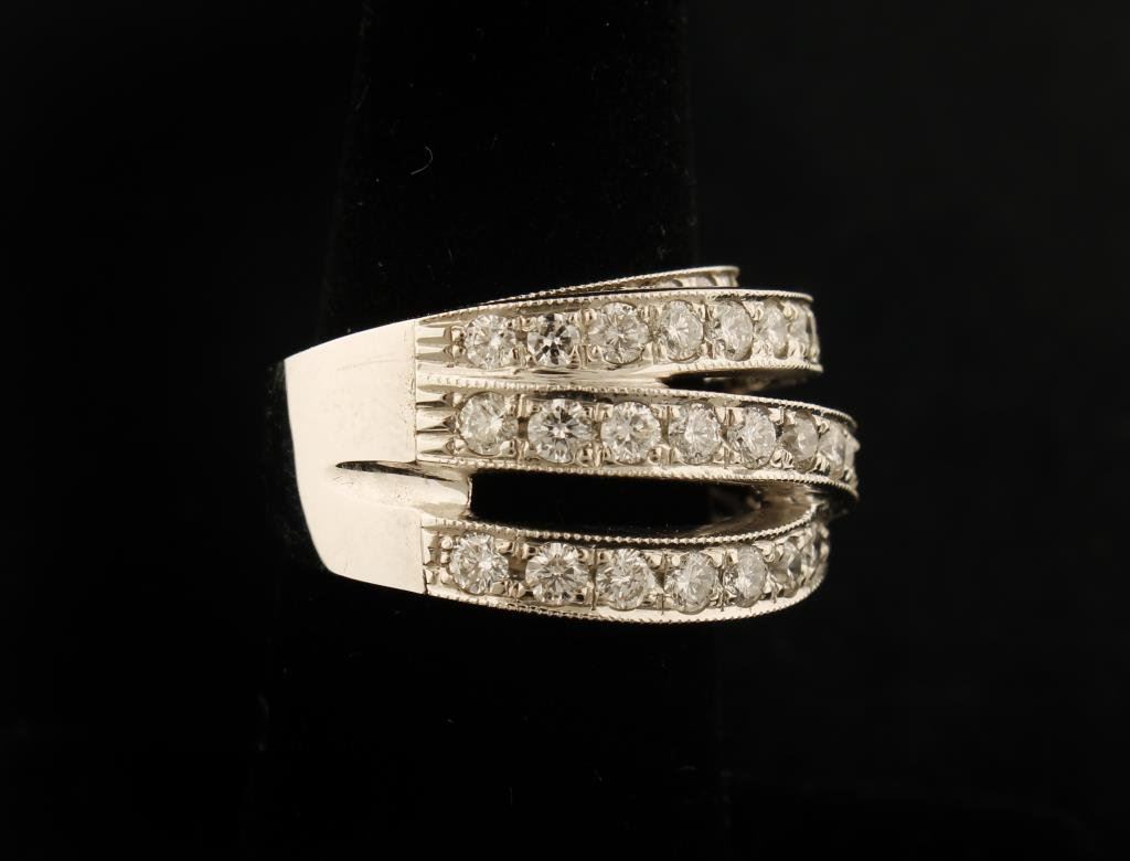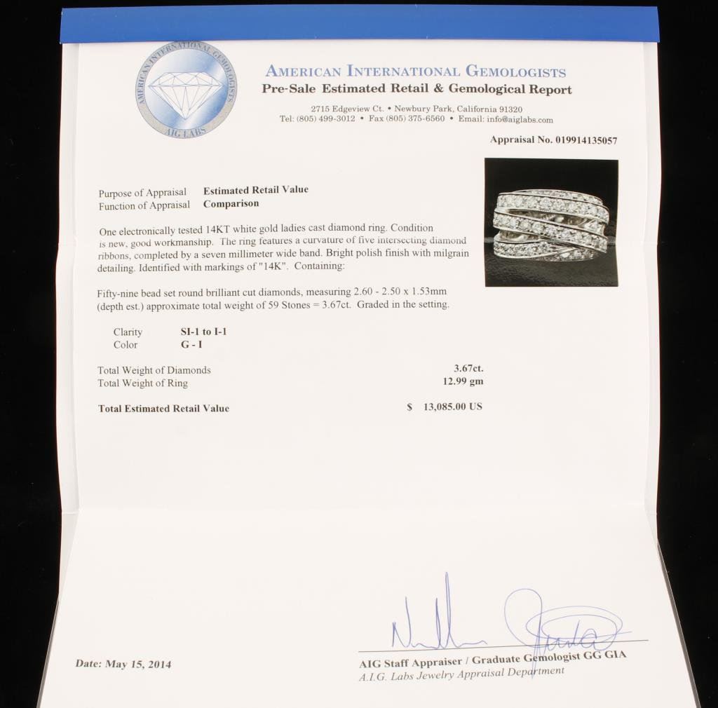 High Fashion and Good Quality Ladies Ring mounted with approx. 3.67 carat total Diamonds in 14K white gold. G-color, SI-1 to I-1 clarity. Appraised by A.I.G. of Newbury Park, Ca, Retail Replacement appraised at $13,085. Est.: $1,500-3,000