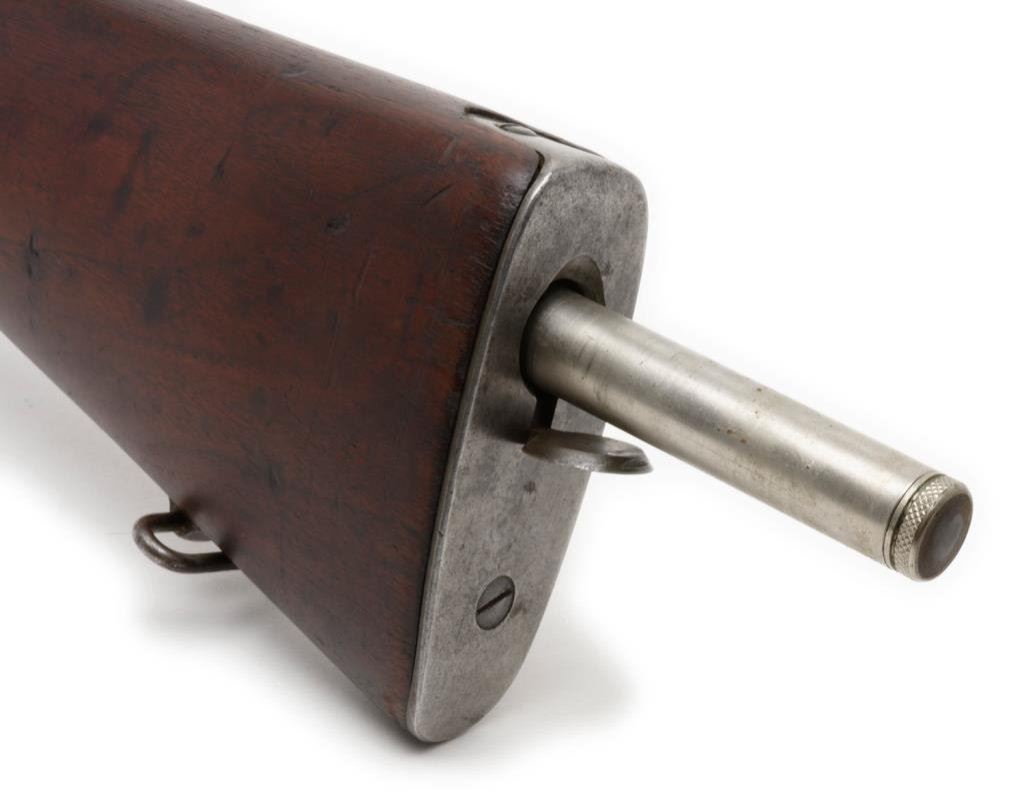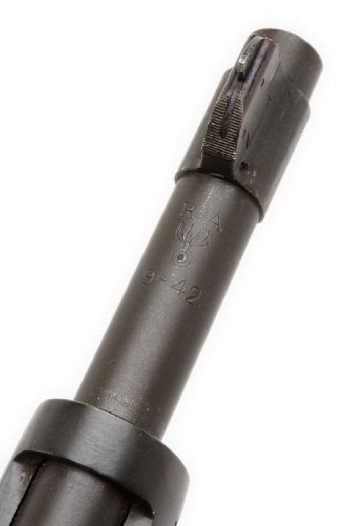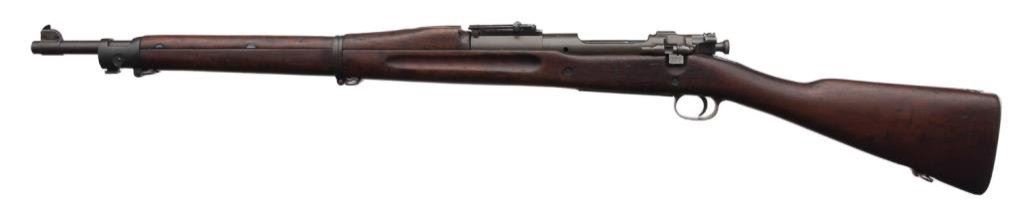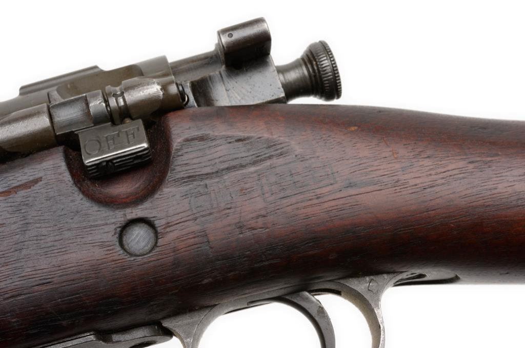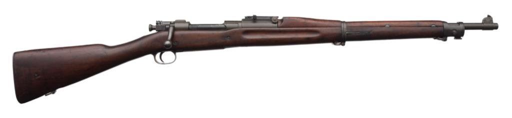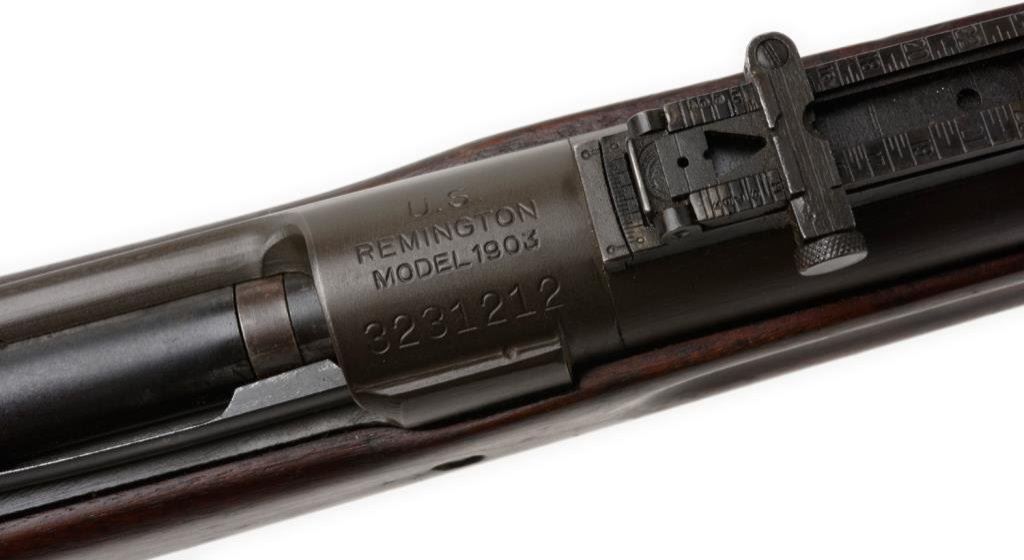 **U.S. Remington Model 1903 bolt action military rifle, .30-06 caliber, 24ā Remington barrel dated 9-42, S/N 3231212, military finish, full length wood stock, sling swivels and metal butt plate with trap and cleaning tube included. This rifle is in overall very good to fine condition displaying the majority of its military finish, very good to fine bore, crisp action and markings, very good + wood stock with circle āPā proof and partially visible inspector cartouches on left side of stock above trigger. Est.: $500-$1,000.