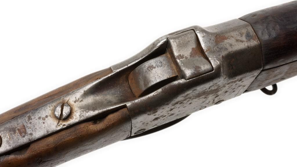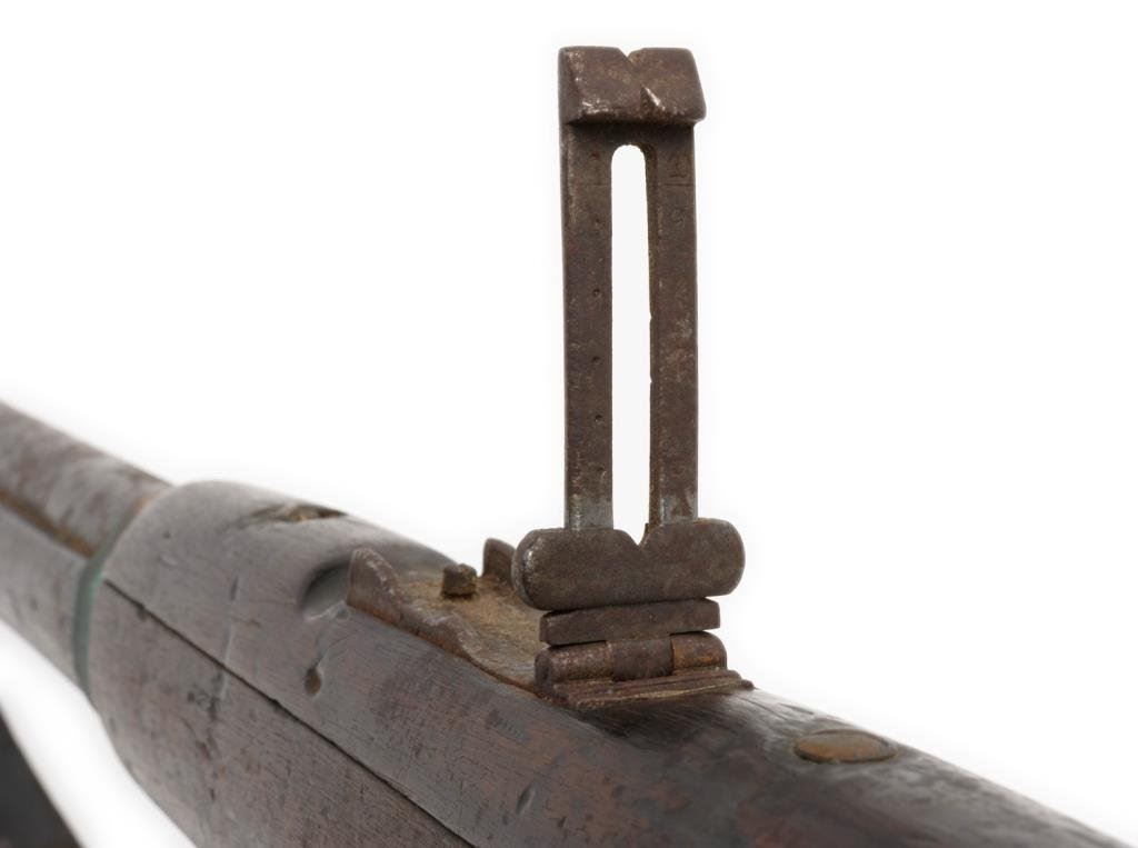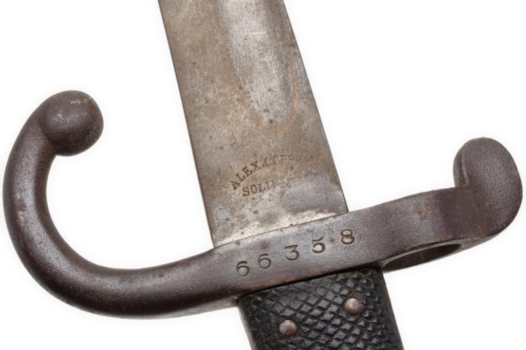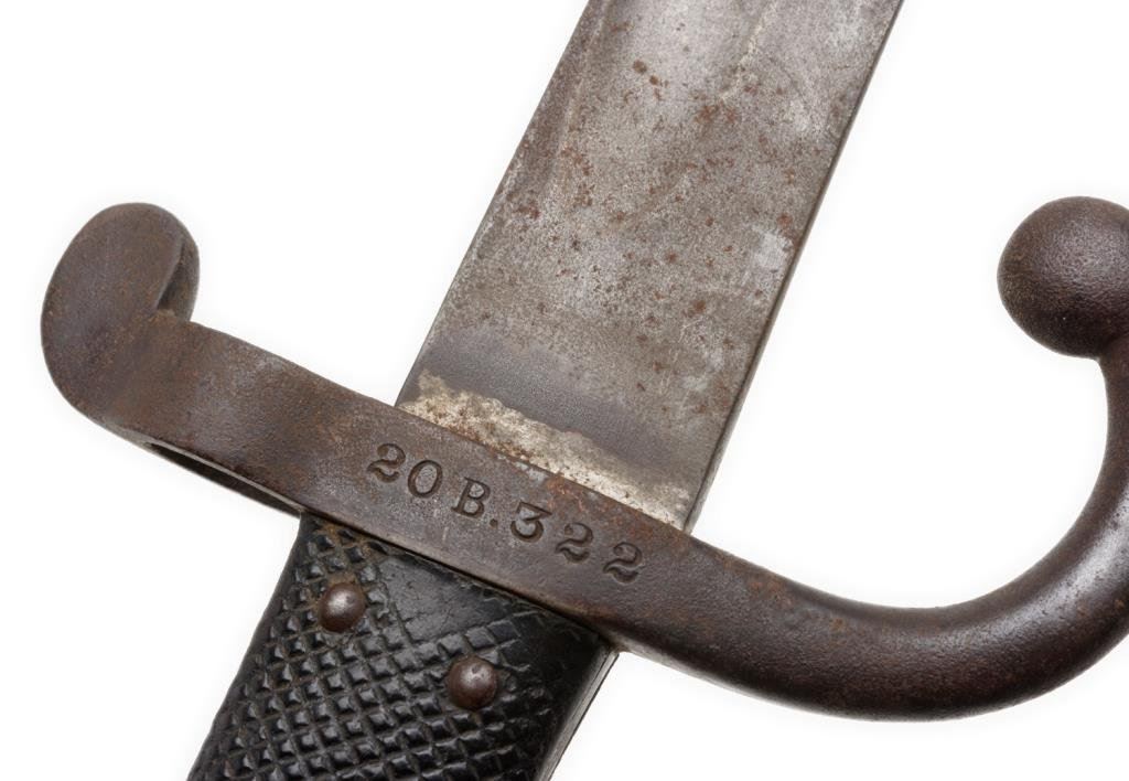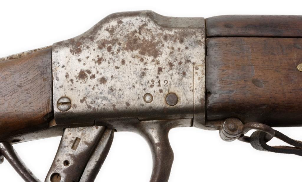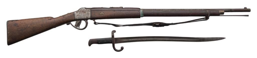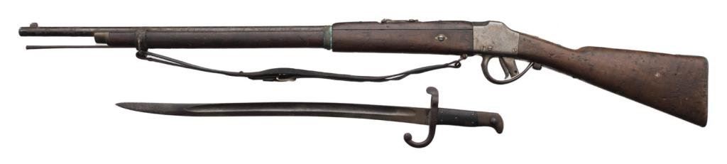 Cobzain falling block rifle with bayonet (no sheath), 11.4mm caliber, 33” barrel, S/N 312, wood stock; overall rough condition with scattered surface rust and pitting, good action, strong rifling in bore, worn wood stocks with scattered mars, scratches and dings; brass butt plate with an old loss at the top of the butt stock. Bayonet shows dark patina and is marked “20 B 322”. Consignor notes indicate possibly Belgian, Chilean or Brazilian. Est.: $150-$250.
