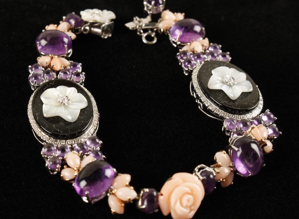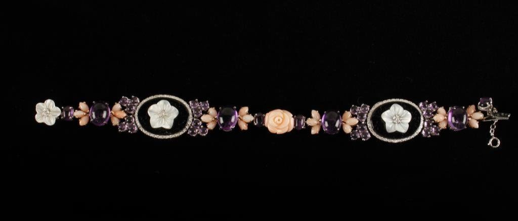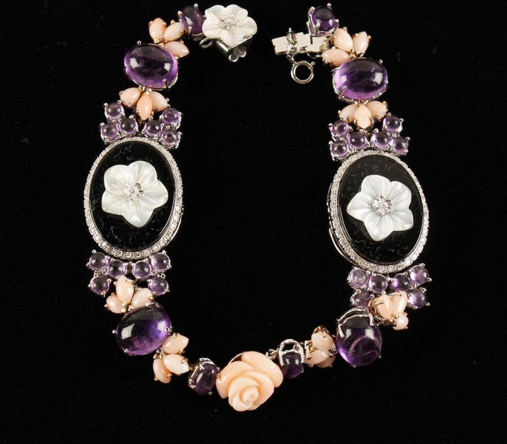 14K white gold bracelet set with Onyx, mother of pearl, coral, and amethyst. Designer piece and likely 1 of a kind. Est.: $1750-$3500