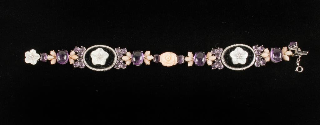 Lot 1454 14K white gold bracelet set with Onyx, mother of pearl, coral, and amethys
