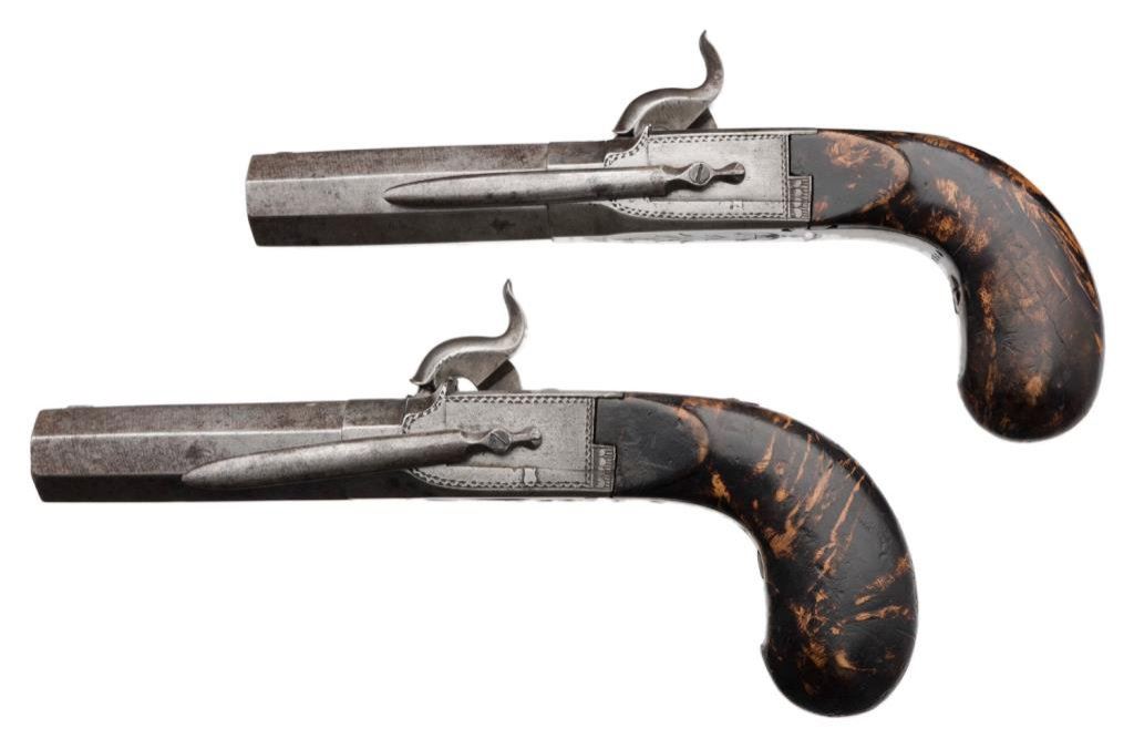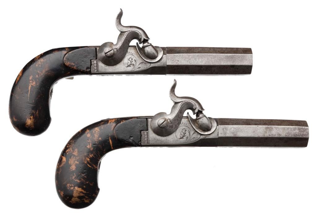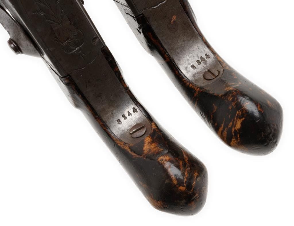 Pair of French large bore belt pistols circa about 1850 in very good to near fine condition. Measures 8 1/4" overall with a 3" octagon BBL's micro-rifled and about .70 Cal. Folding triggers with belt hooks. Lightly engraved and S/N 5844 on each pistol. No makers name but very good quality. The condition is exceptional with just minor erosion and staining to original bright polish on the metal. The stocks are stained to simulate burl wood and are also very good plus. Est.: $600-$1200