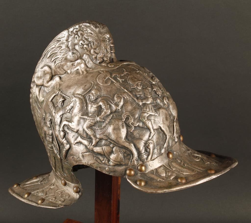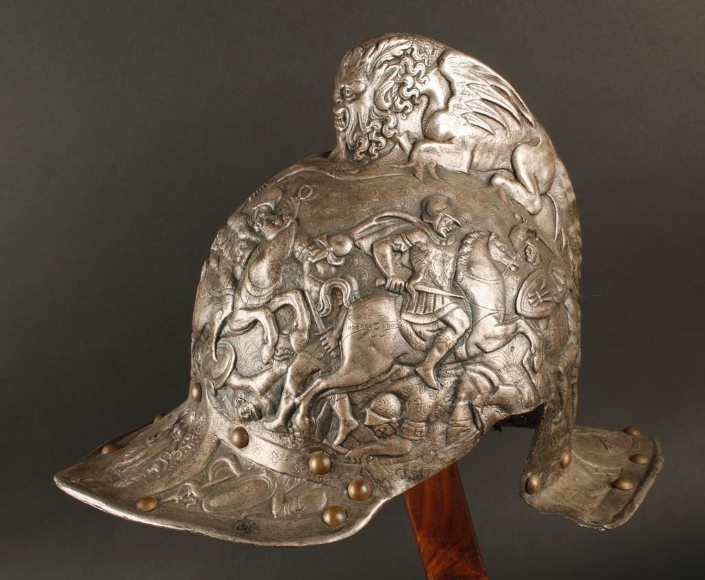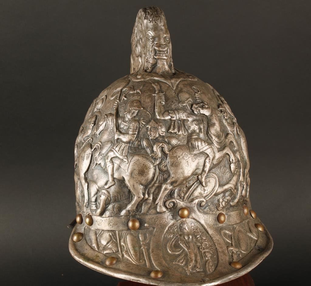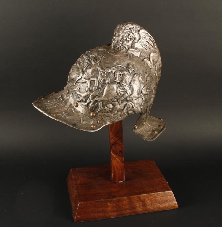 Elkington metal reproduction helmet from 19th century on display stand. Major museums and institutions produced this type helmet for collections in the 19th century off masterpieces in Royal armories. Recently they have fetched up to 12 on the American auction market. Est.: $1500-$3000