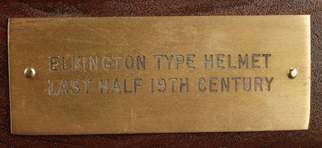 Lot 1581 Elkington metal reproduction helmet from 19th century on display stand. Ma