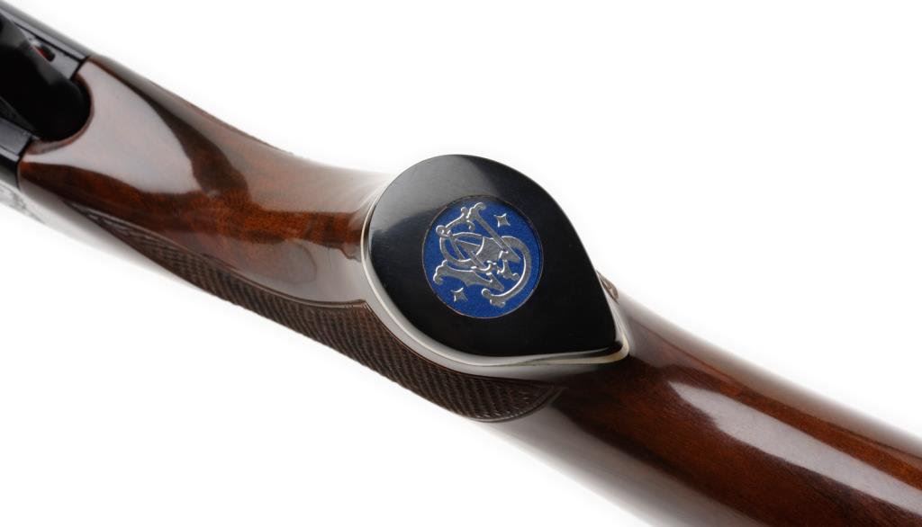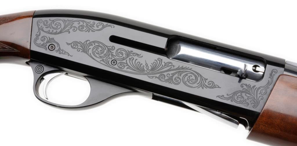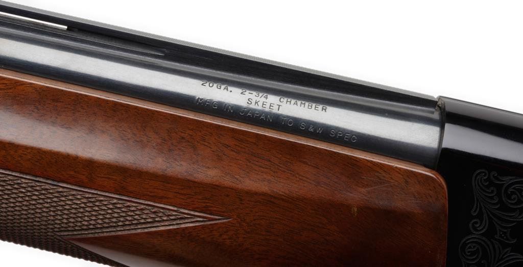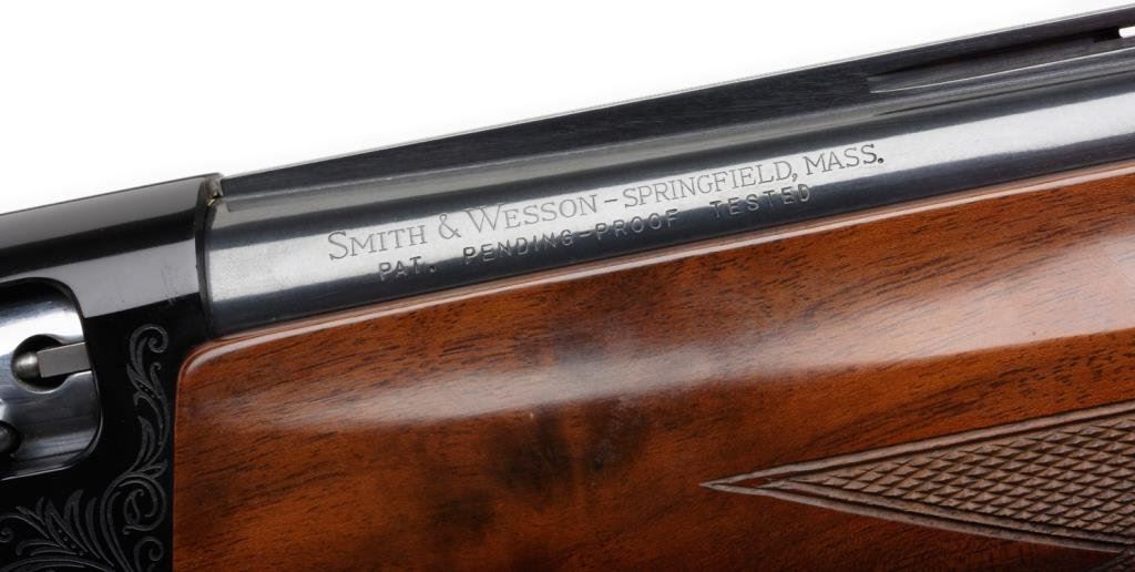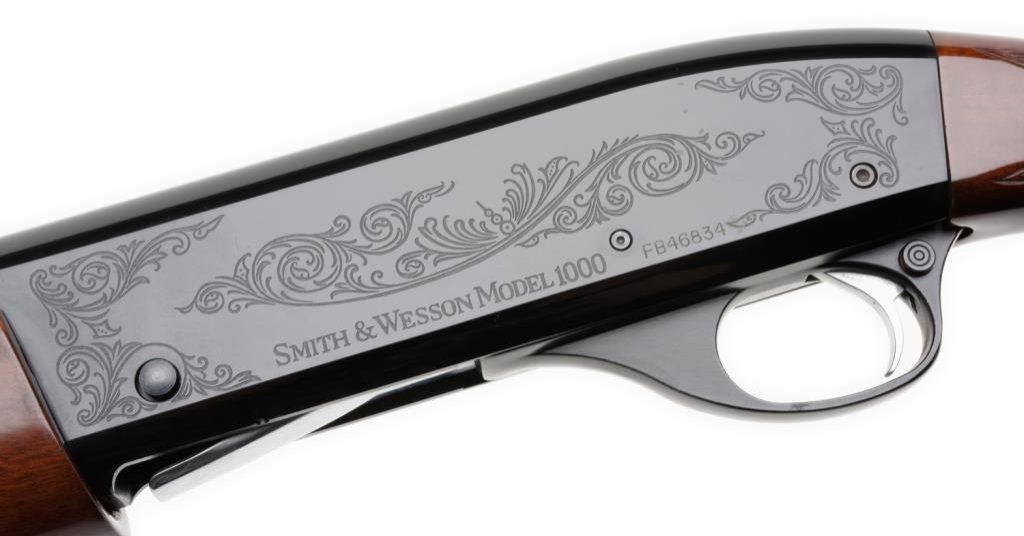 *Smith and Wesson Model 1000 semi-automatic shotgun, 20 gauge, serial #FB46834. The shotgun is in overall excellent condition with a 26” barrel with full length ventilated rib and metal bead front sight. The barrel and receiver retain nearly all of their dark blue finish, showing little if any use. The checkered wood stocks are likewise in excellent condition with only faint handling marks apparent. The butt stock is finished with a white line ventilated rubber pad and a 13 ¼” LOP. The bore is excellent, the action crisp and markings sharp on this lightly used shotgun. Est.: $400-$800.
