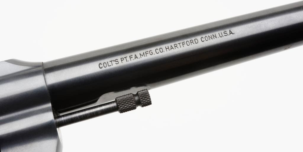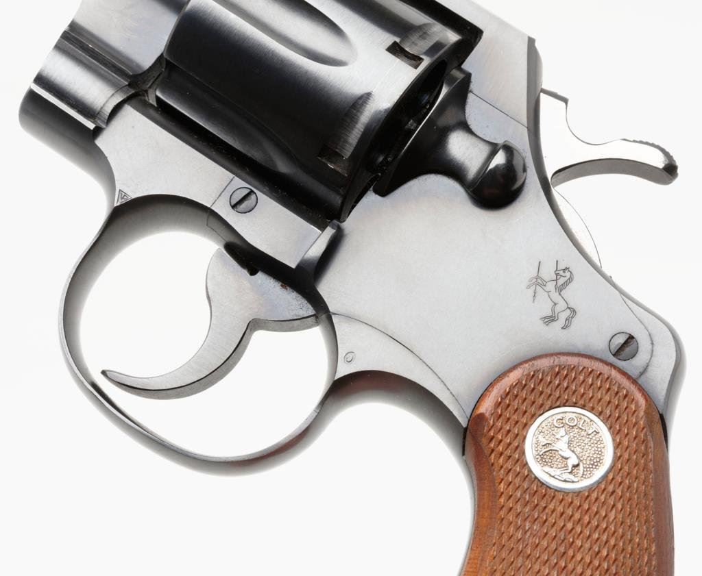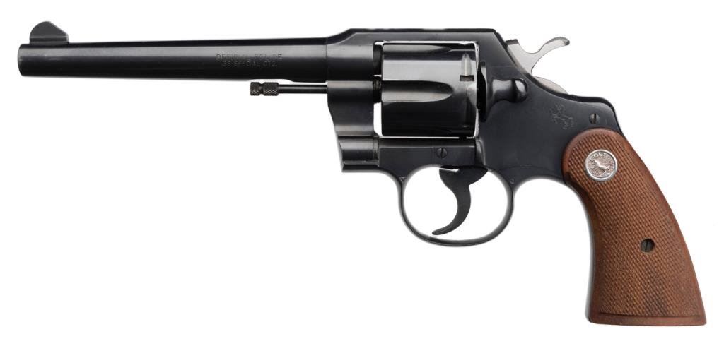 **Colt Official Police DA revolver, .38 Special caliber, 6” barrel, S/N 872759, blued finish, checkered wood medallion grips; overall excellent condition. Est.: $300-$600.