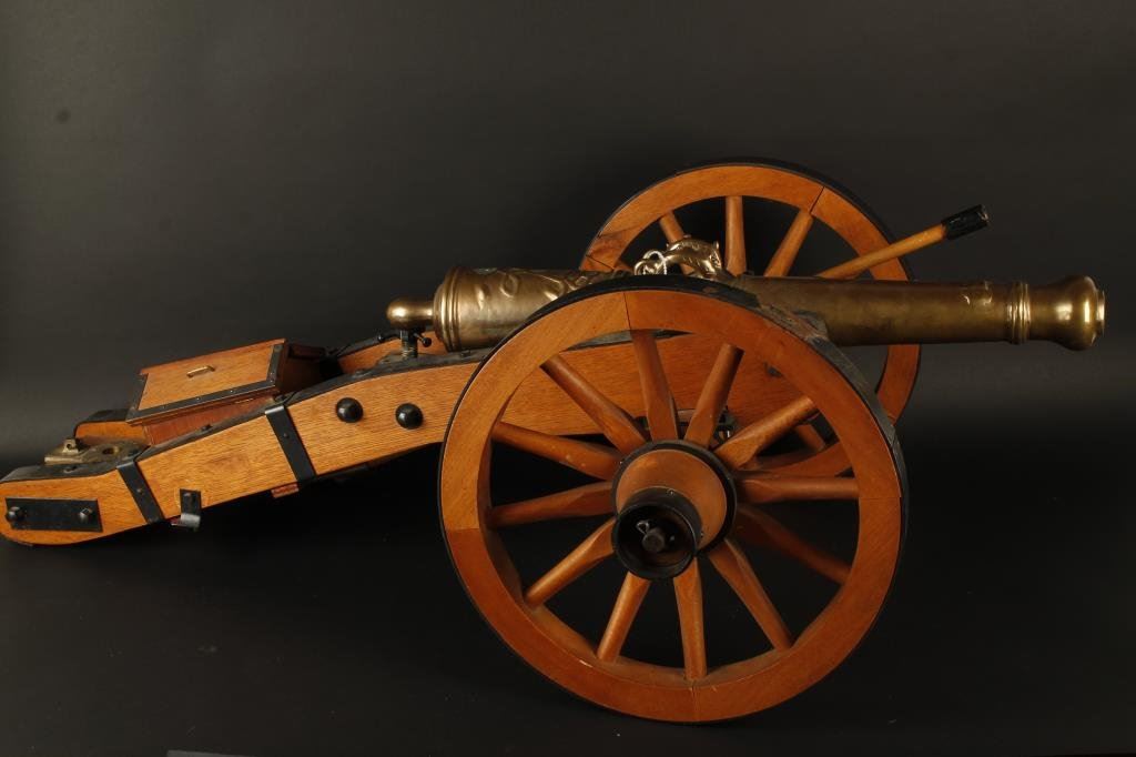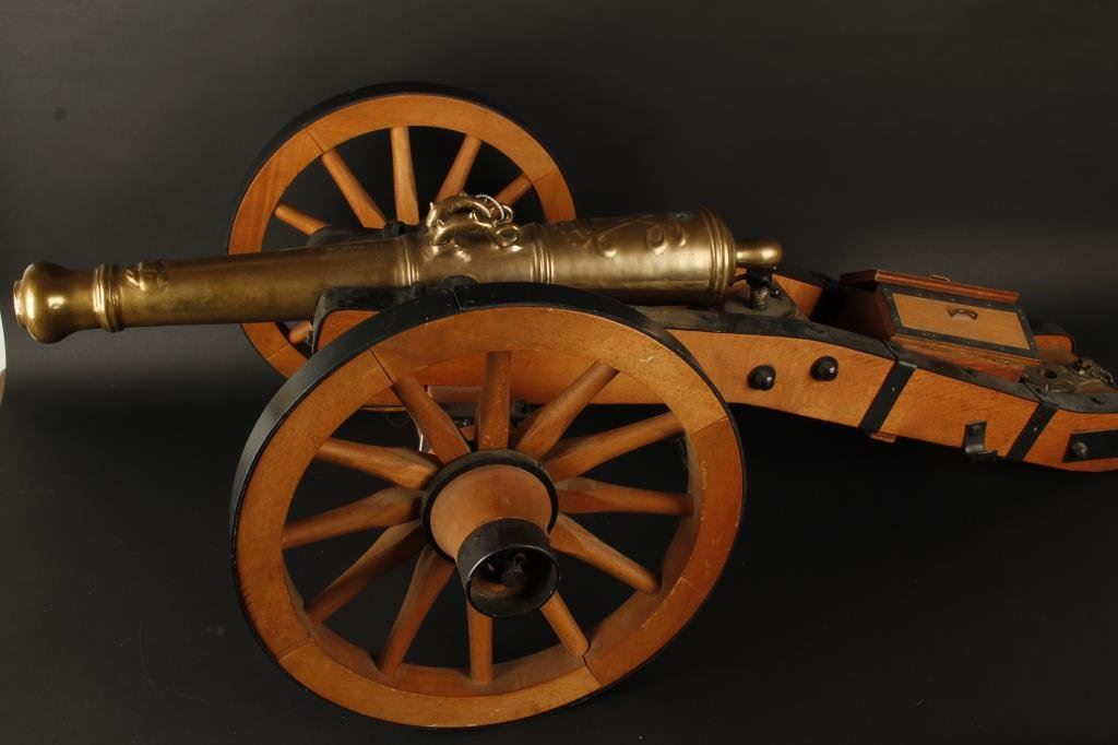 Hi quality German proofed reproduction of 19th century field cannon with brass tube. Probably 60-70s. 23 1/2" tube with a 1" bore. Well detailed. Some accessories. Est.: $750-$1500
