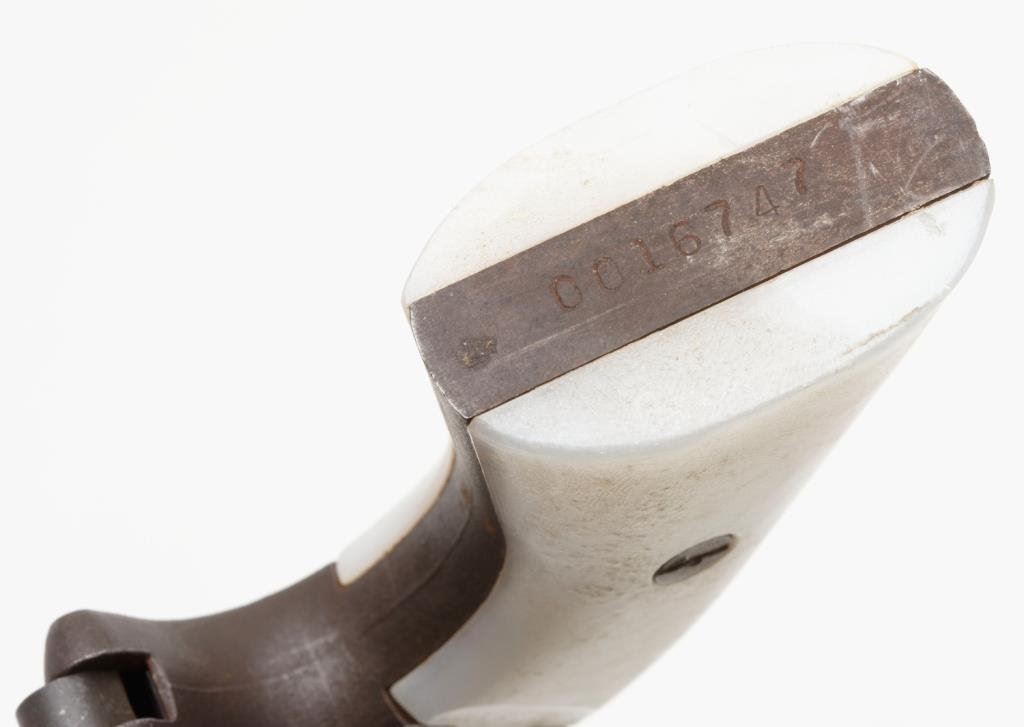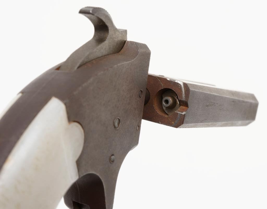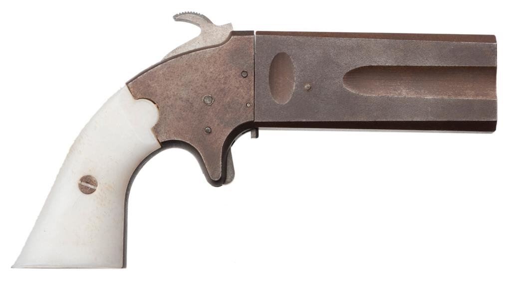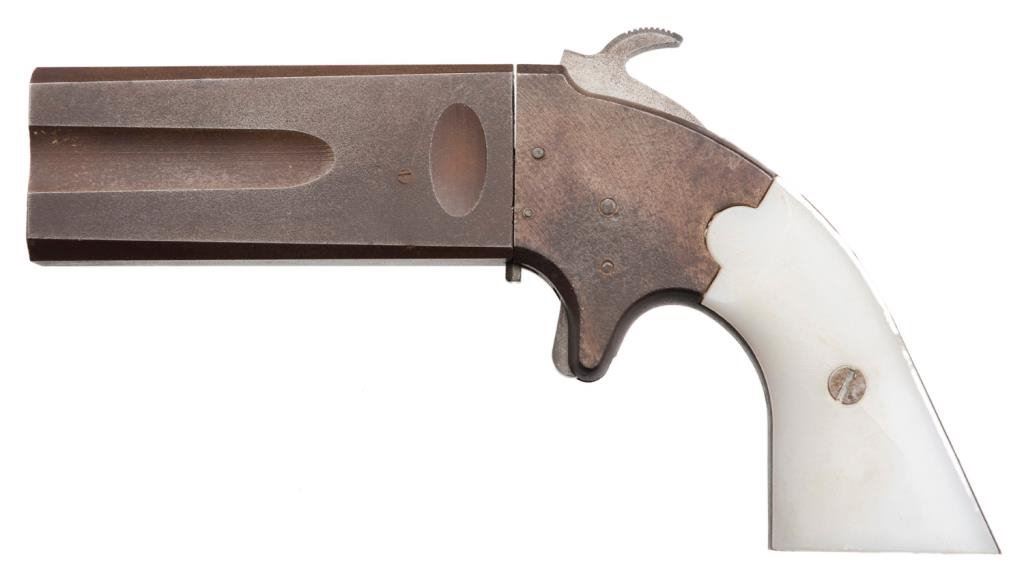 Reproduction copy of an over/under swivel barrel percussion derringer with faux pearl grips, .38 caliber, S/N 0016747, heavy coat of surface rust overall; action working. Est.: $50-$100.