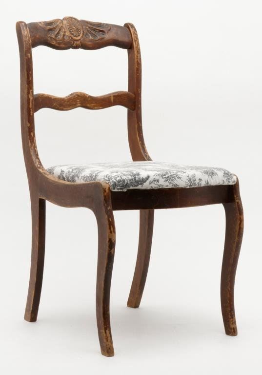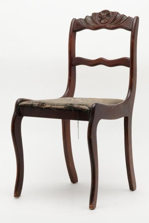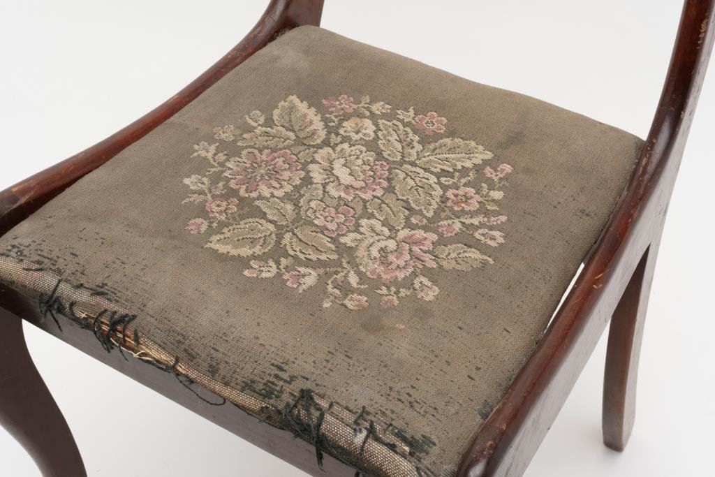 Lot of two antique carved wood chairs. Both chairs are in good condition showing small mars, loss of finish and scratches. One chair retains the original embroidered cushion showing significant wear, fading and tattered at the front, the other with the cushion having been recovered in fabric. Nice chairs in need of some TLC. Est.: $50-$100.