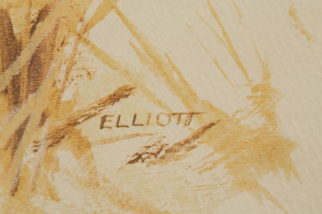 Framed print of Britney Spaniel by Elliott, approx. 21” x 27”; nicely accomplished; along with 2 decoy ducks. Est.: $75-$125.
