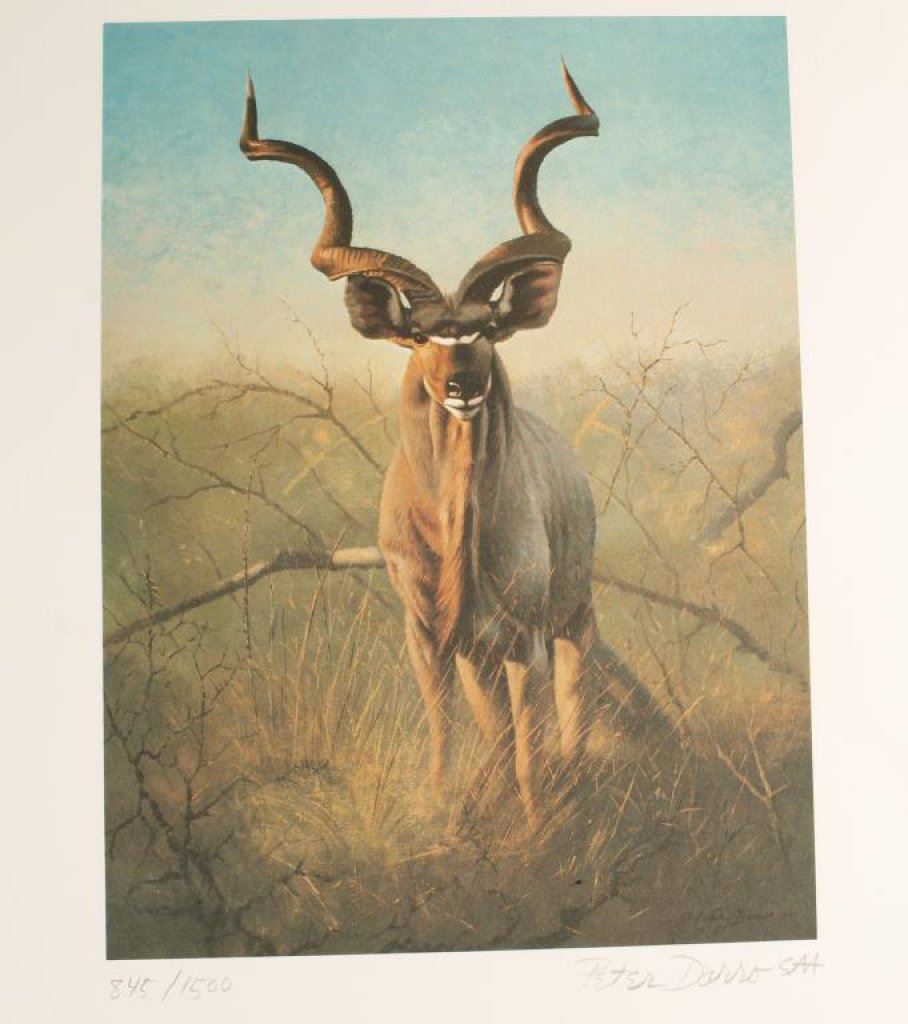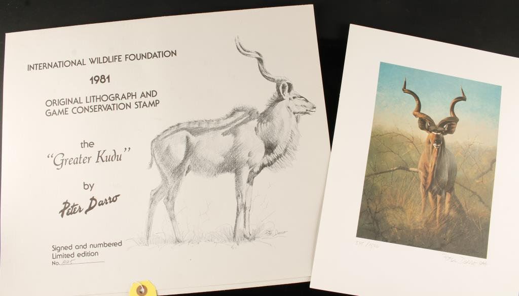 Signed and Limited Edition (#845/1500) color print entitled “Greater Kudu” by noted wildlife artist Peter Darro, issued by the International Wildlife Foundation (1981) in folio; approx. 15” x 11.5”. Est.: $50-$75.