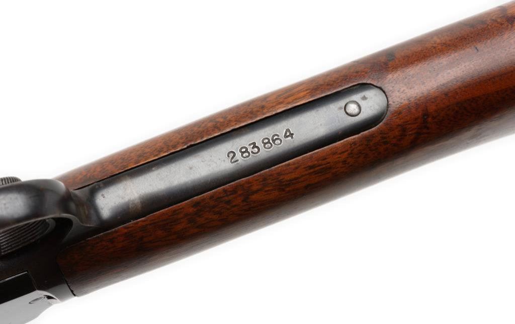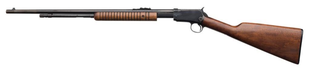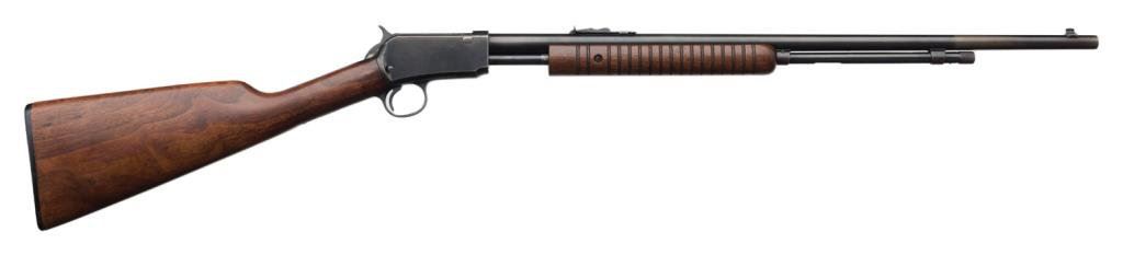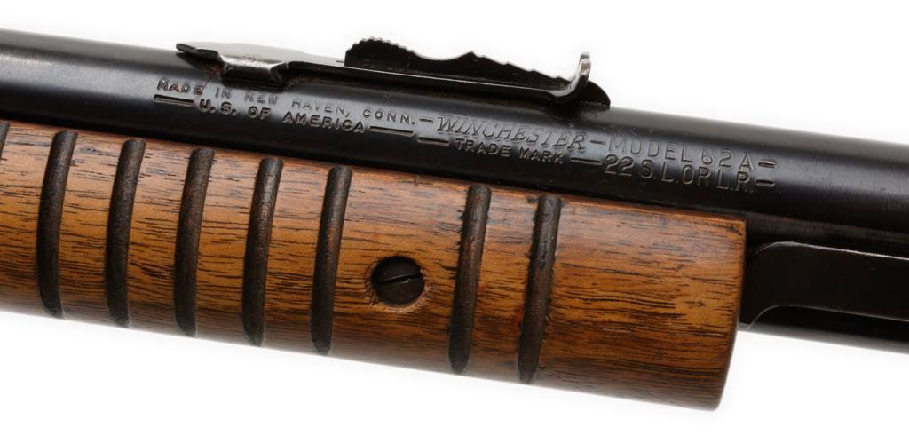 *Winchester Model 62A pump action rifle, .22 short, long or LR caliber, 23” round barrel, S/N 283864, blued finish, wood stocks, in overall very good + condition with area of finish toned to brown near muzzle; very good + bore, crisp action and very good wood. Est.: $300-$600.