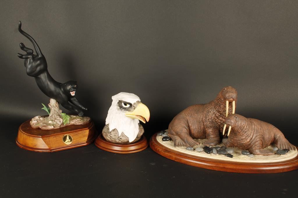 Three piece animal sculptures in porcelain. Black raven 1987; Walrus. Est.: $100-$200.