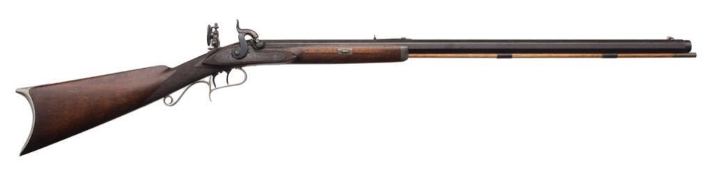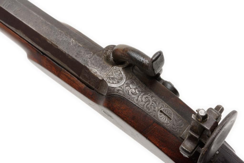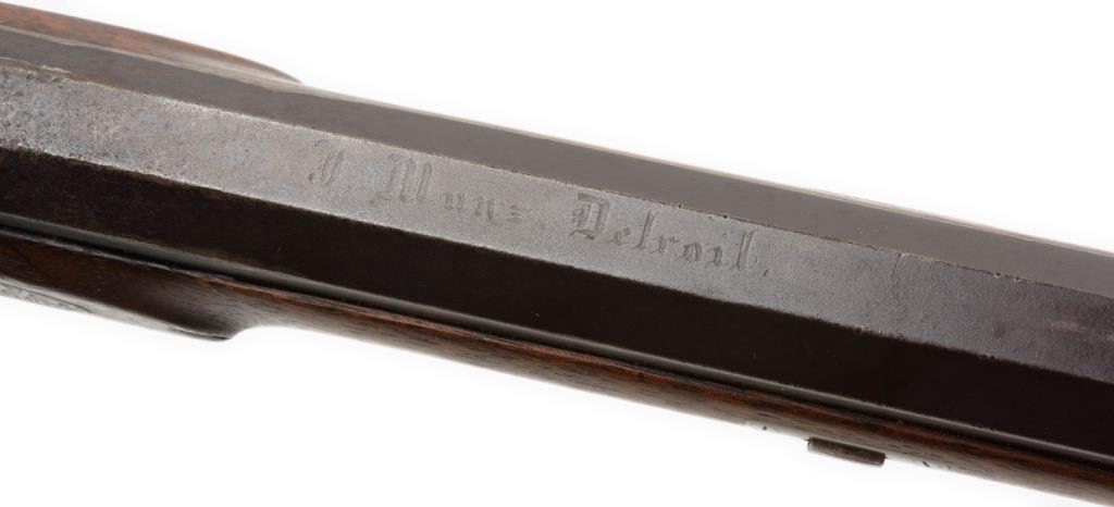 Lot 2698 Percussion half stock target rifle by T. Munz, Detroit, .36 caliber, 30” o
