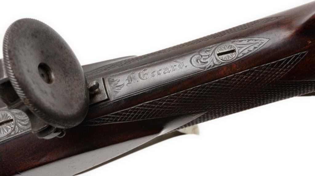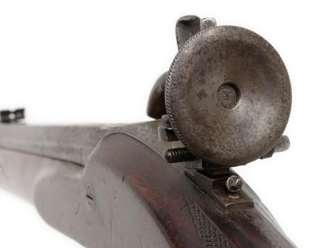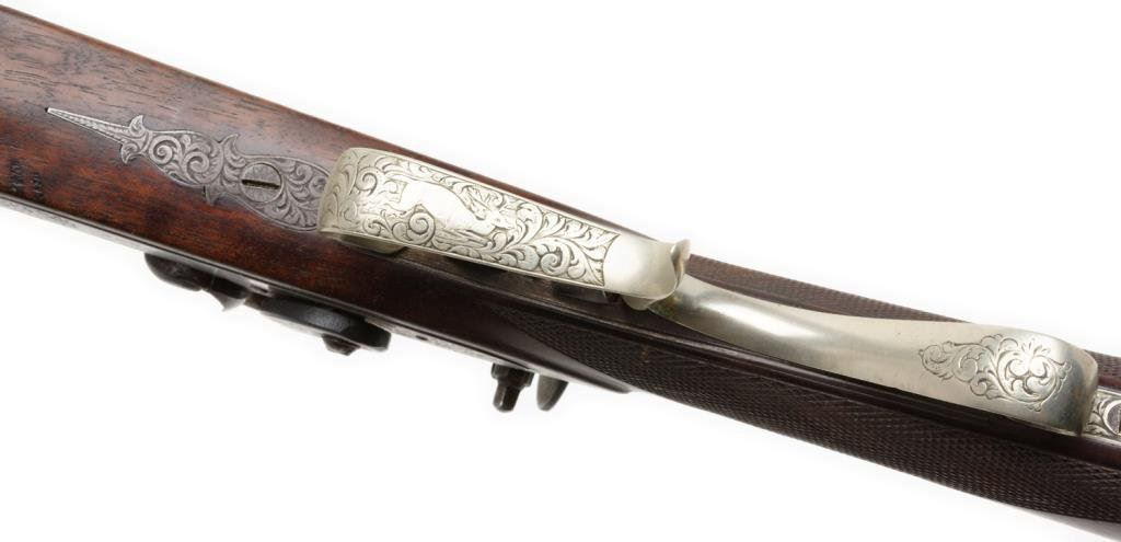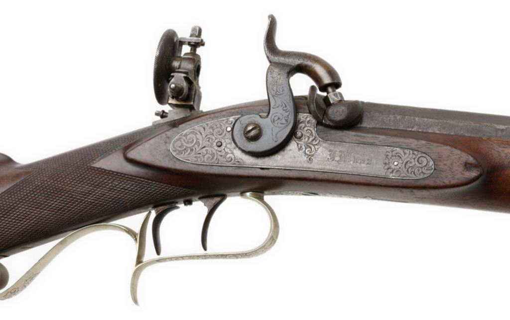 Percussion half stock target rifle by T. Munz, Detroit, .36 caliber, 30” octagon barrel, double set triggers, tang peep sight, checkered wood stock in overall very good condition with working set triggers at time of description. Est.: $750-$1,500.