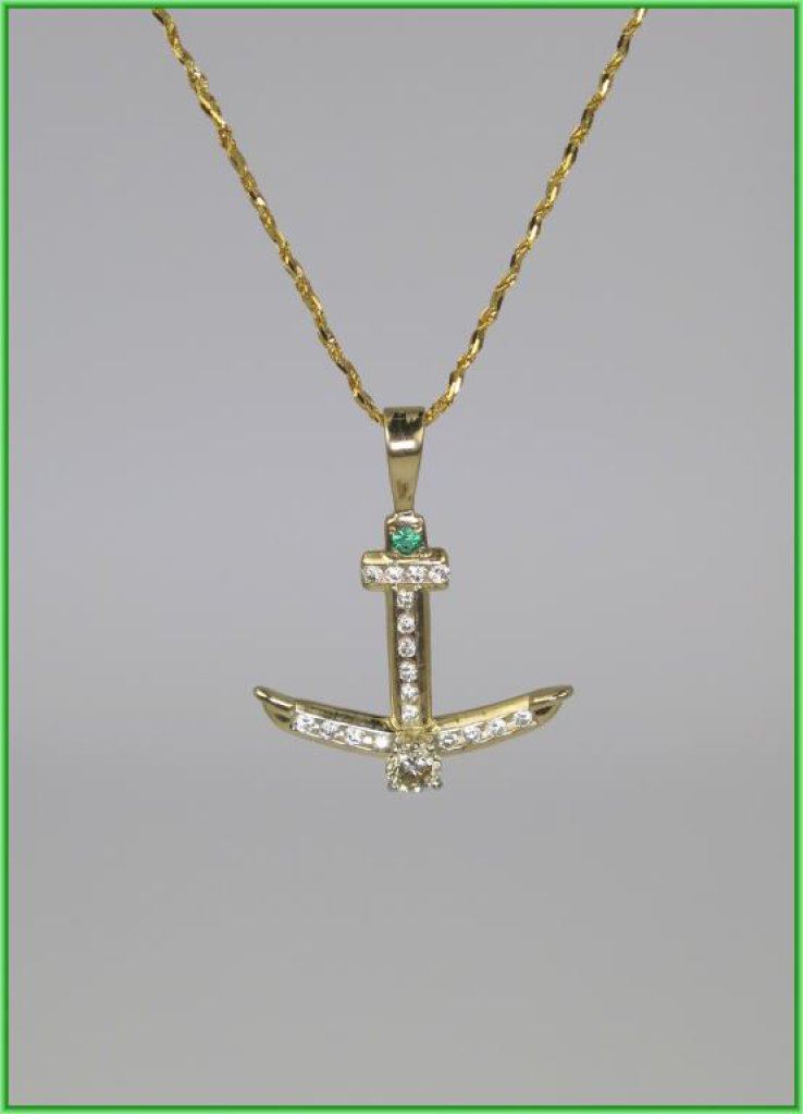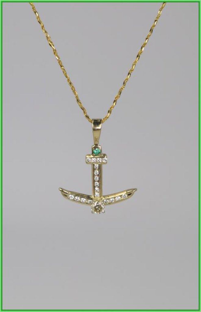 Classy Diamond and Emerald Nautical Pendant featuring a 0.45 carat round cut with 18 accent diamonds weighing approx. 1.00 carat total with H-J colors and SI clarity with additional small emerald set in 14 karat yellow gold. Retail $1,800-$2,400 Estimate $1,000-$1,200