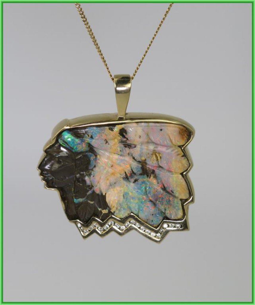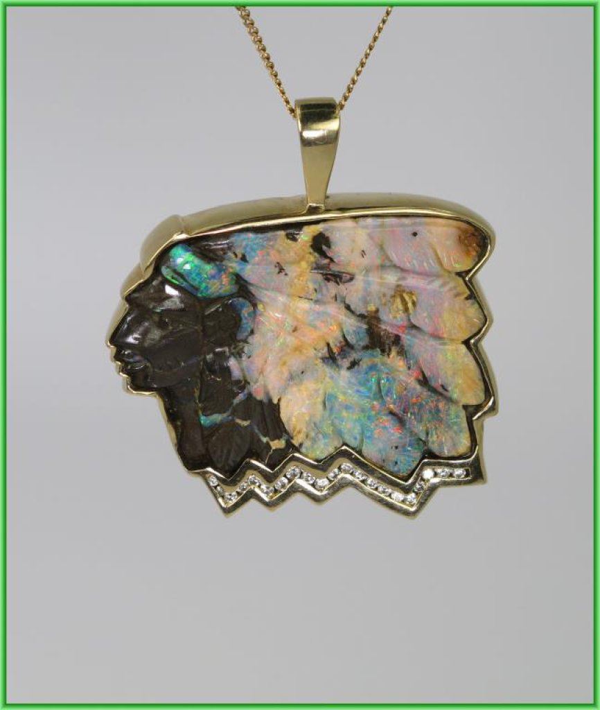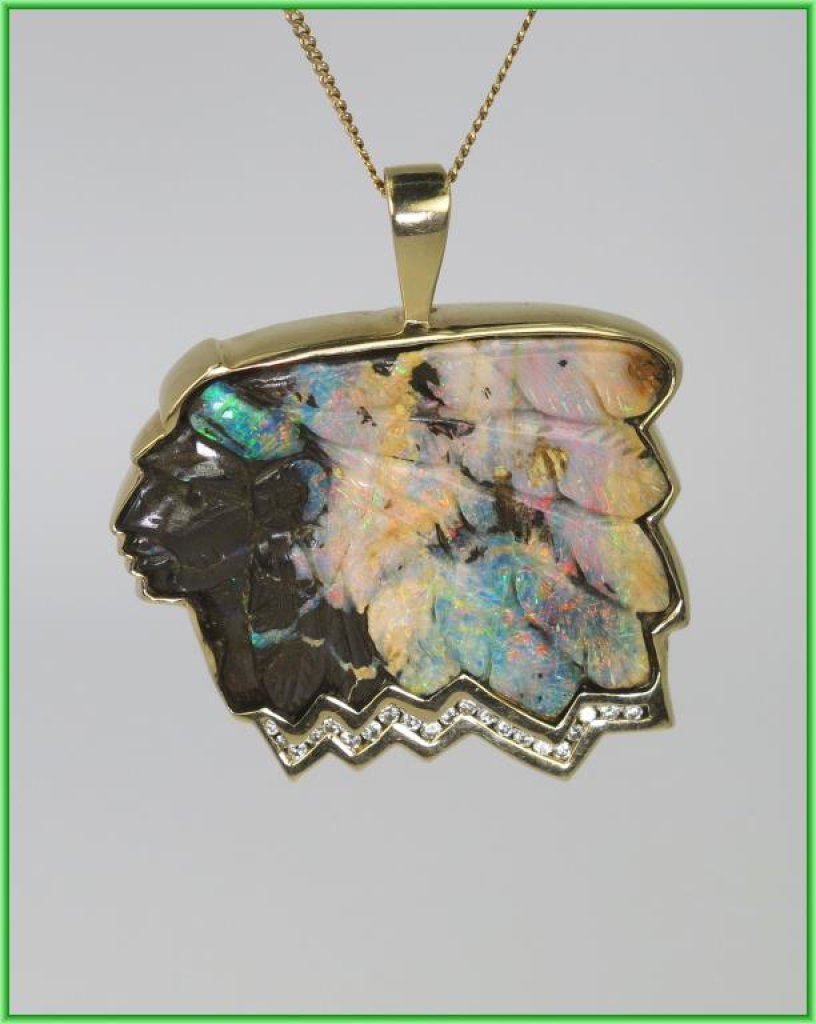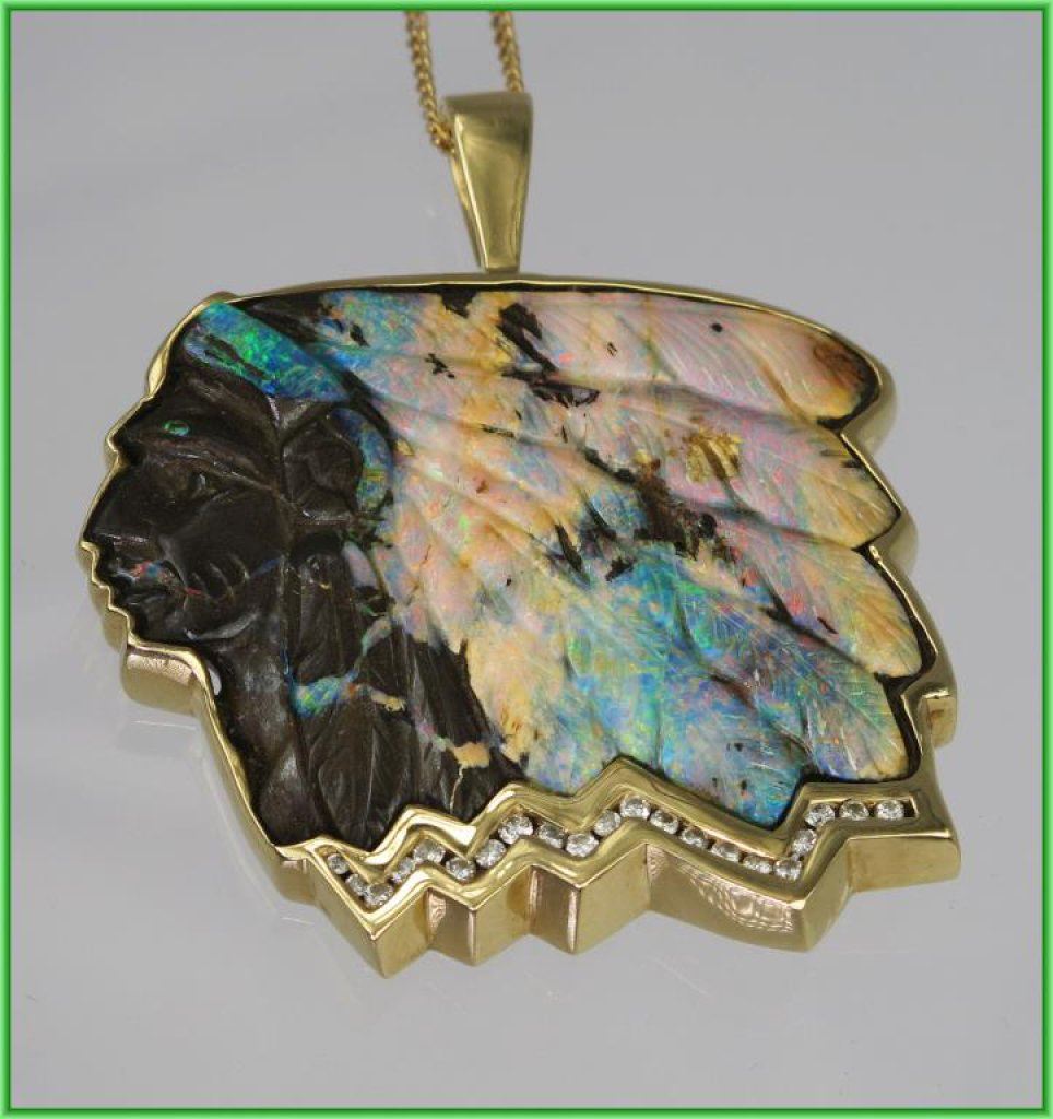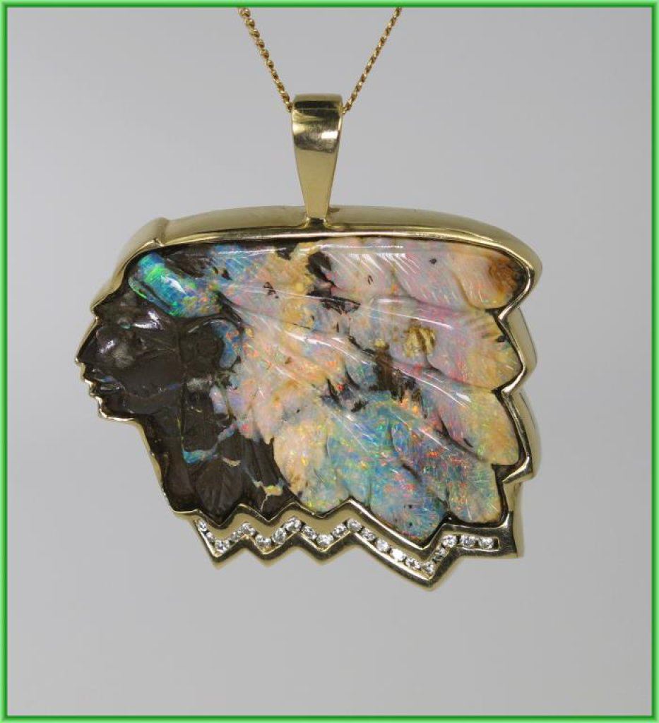 Amazing One of A Kind Australian Bolder Opal and Diamond Pendant Artisan Carved American Indian Chief motif with feathered head dress hand carved opal with color flashes in orange, pink, blue and green accented by 21 round cut channel set Diamonds weighing 0.42 carats with G-H colors and SI clarity set in 14 karat yellow gold, this unique piece is artist stamped and measures 1.5” in height and 2” wide overall weight is 44.3 grams with chain. Outstanding Collectors Piece - Please View FULL Appraisal. Retail $6,000-$8,000 Estimate $3,000-$4,000