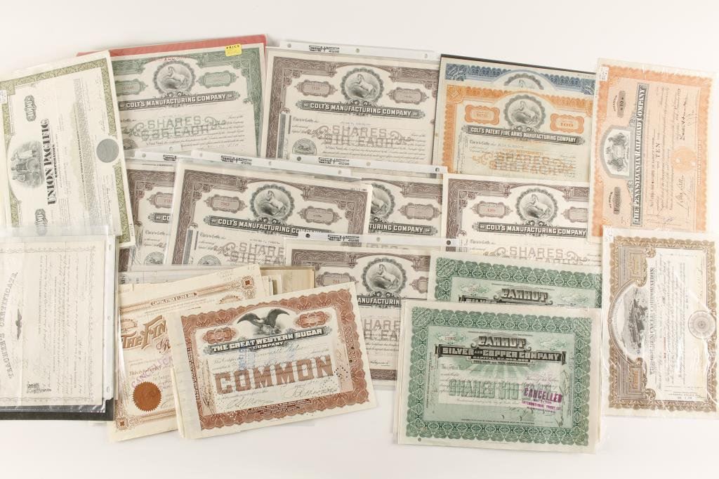 Lot of collectible paper and old stock certificates including correspondence on Chicago & North Western Railway Co. letterhead dated 1881; railroad and mining stock certificates and approximately 14 Colt’s Manufacturing Co. stock certificates. From the estate of the late Joe Kiser. Est.: $300-$400.