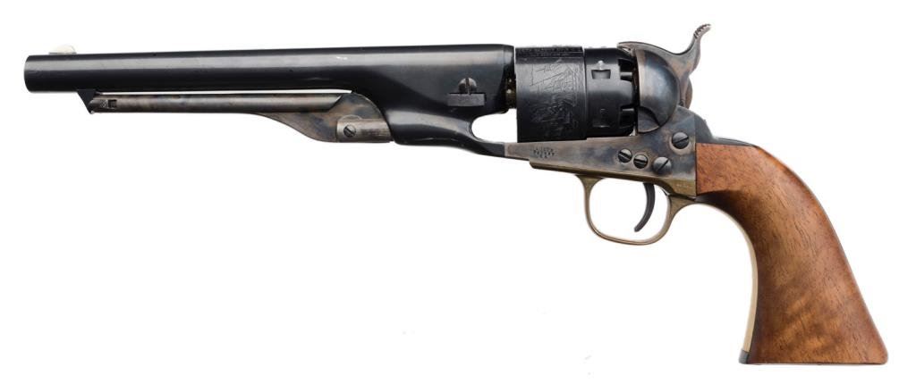Colt New Series Blackpowder Model 1860 Army percussion revolver, .44 caliber, 8” barrel, S/N 205701, blued and case hardened finish, wood grips; overall fine condition showing little if any use. Est.: $400-$500.