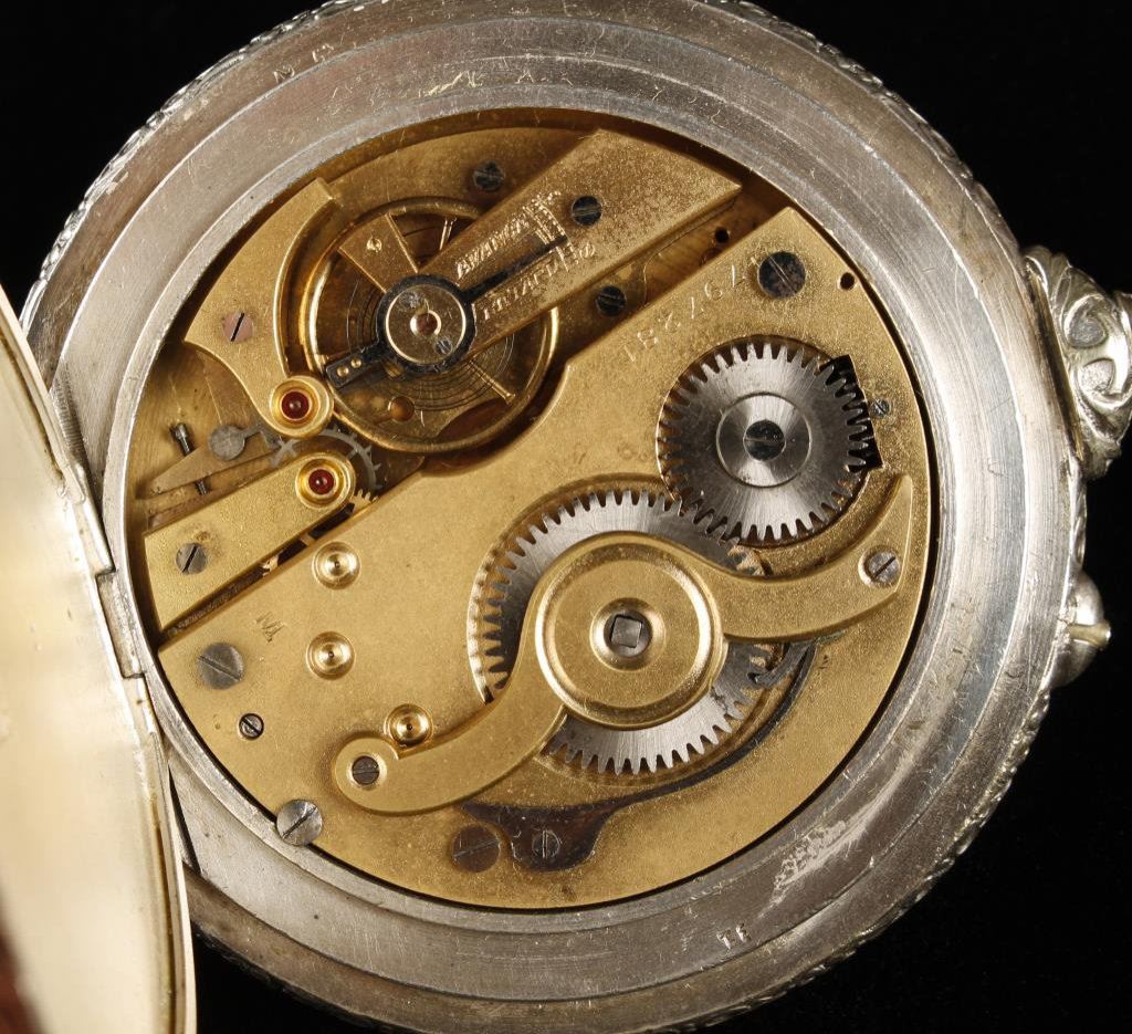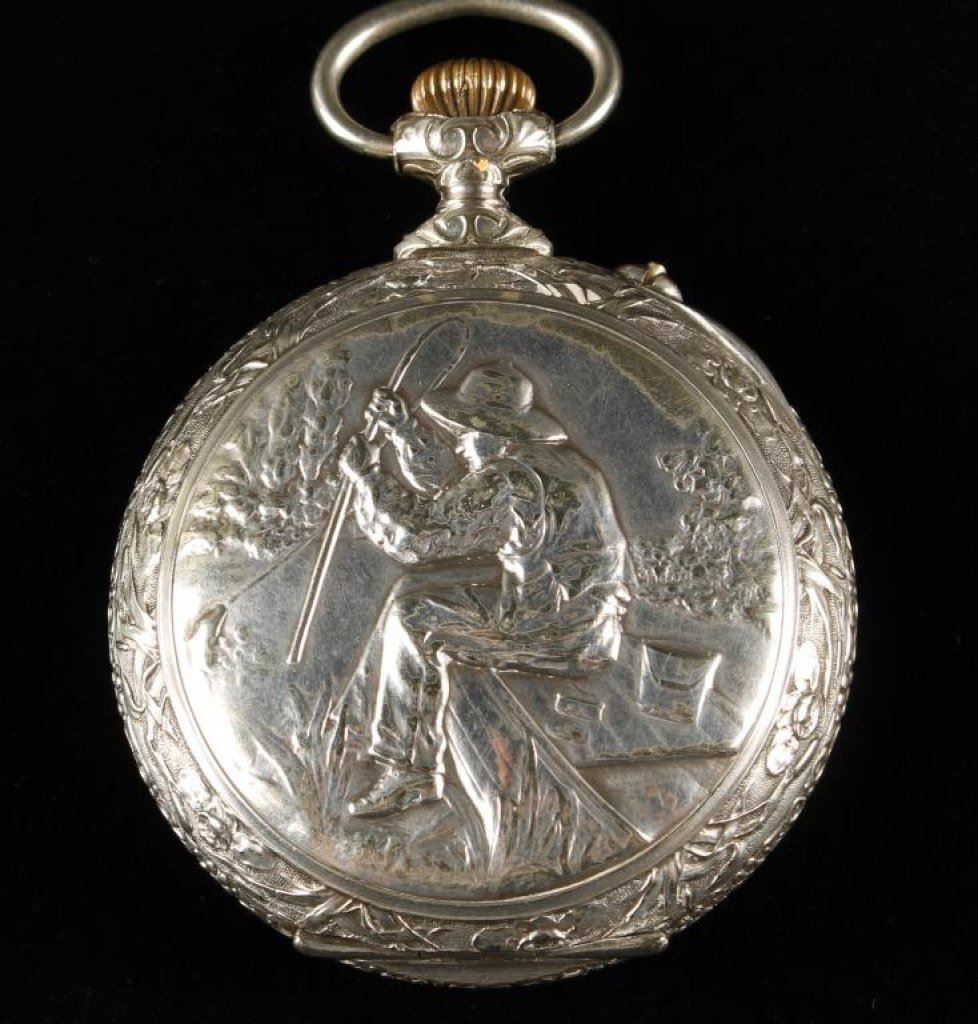 Large fancy open faced pocket watch, approximately 3” in diameter with Roman numeral face; not working at time of description. Est.: $400-$500.
