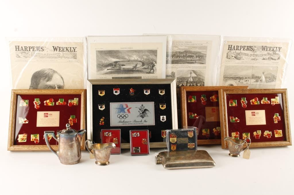 Coca Cola Pins, 3 sets of Santa Claus in boxes, Olympic pin set 4 pcs., 4 newspapers and advertisements, Harpers Weekly 1877, mostly Indian subjects back to 1866, Brownie camera, 4 silver plated items, 1 hip flask Est.: $50 - $150.