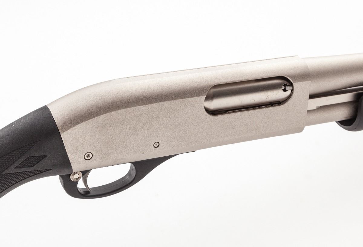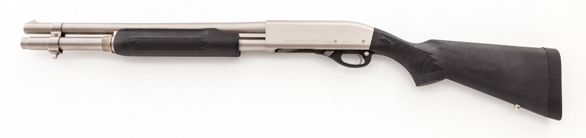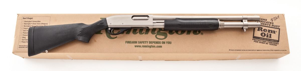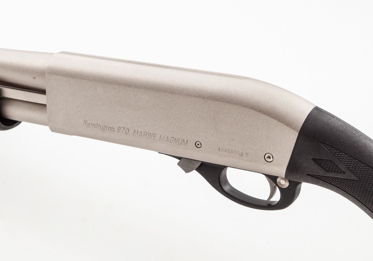 Remington Model 870 Marine Magnum Pump Action Shotgun, #AB858959M, 12 ga., 18'' barrel choked Cyl., nickel finish, synthetic stock. Condition is excellent, appearing as new and unfired, in original box. Est.: $500-$750. (Modern)