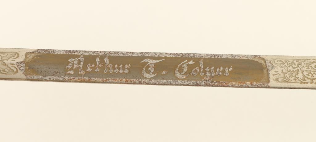 Knights of Columbus ceremonial sword and metal scabbard by Craddock Mercantile Co., Kansas City, MO. in overall good condition with the name “Arthur T. Colyer” etched on the blade. The sword and scabbard both show dark patina to brassmounts and an un-cleaned blade as well as an un-cleaned body of the scabbard. Est.: $50-$100.