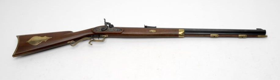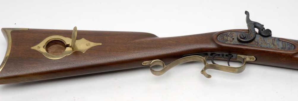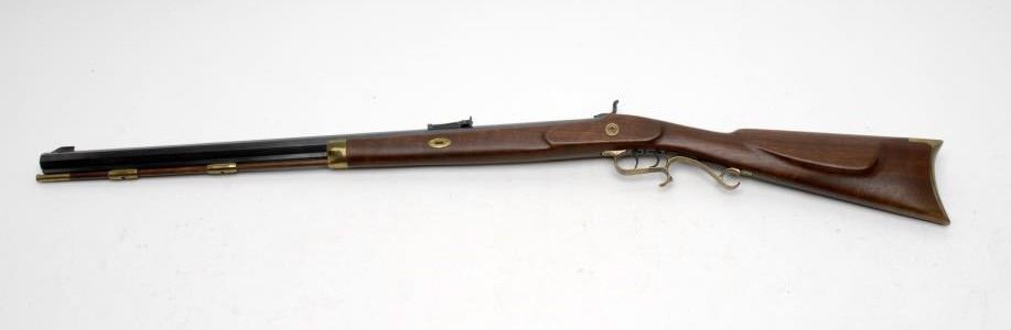 Thompson Center Arms reproduction black powder rifle, .50 cal., serial #K8559. The rifle is in overall nearly excellent condition with a 28” octagon barrel. The barrel retains nearly all of its blued finish with little wear. The riflefeatures brass hardware, trigger guard and patchbox in the butt. The smooth wood stock is in very good condition showing little use. The butt stock ends with a brass, crescent butt plate. Est.: $100-$200.