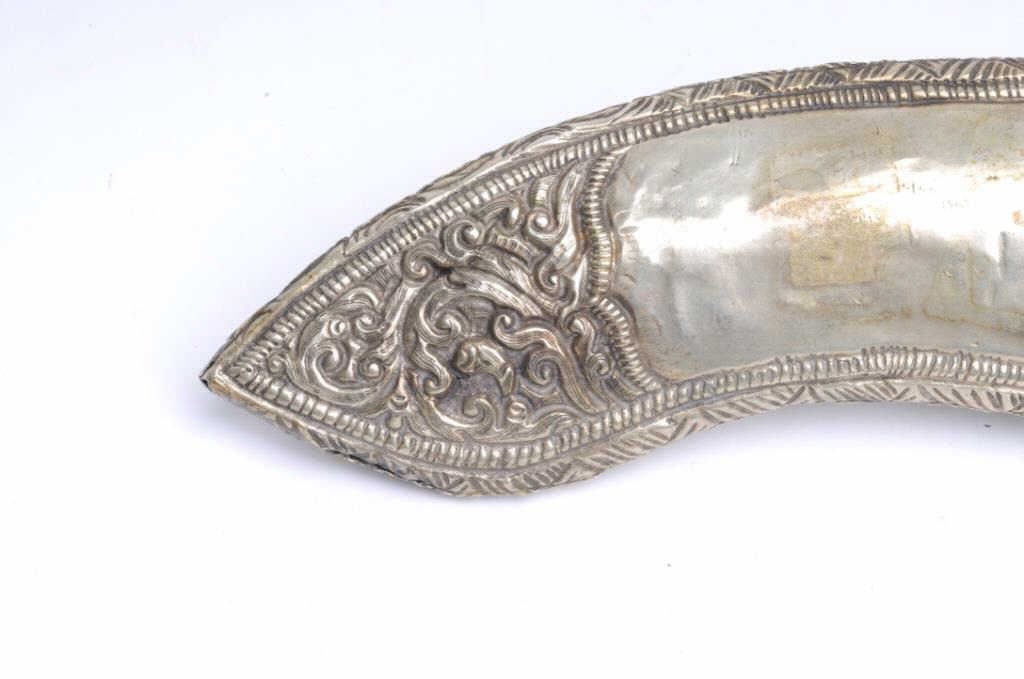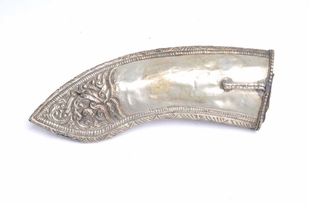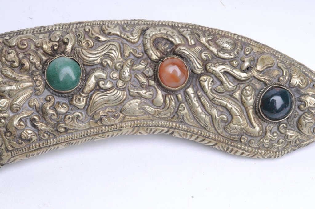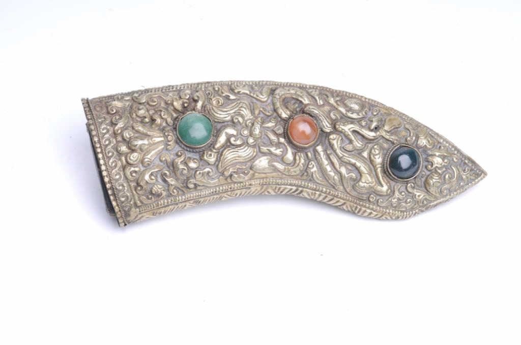 Lot 15a Ornate knife scabbard from Asia with hand worked silver set with 3 gem stones. Measures 7 ½” x 2 3