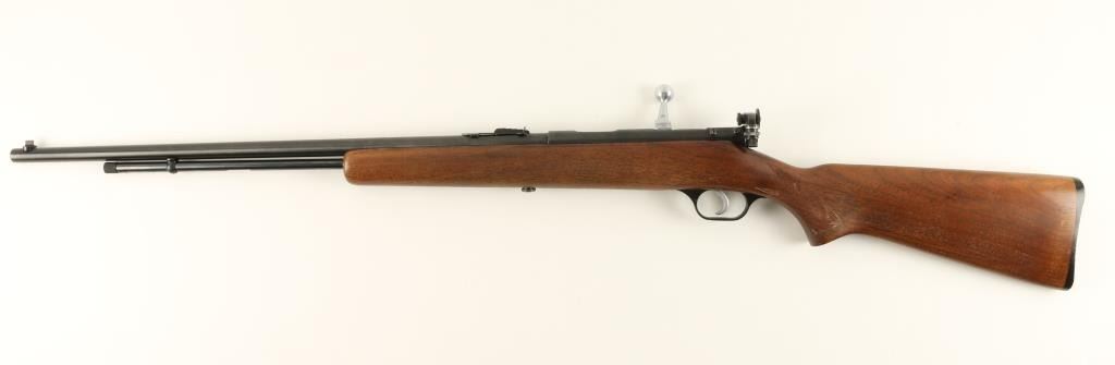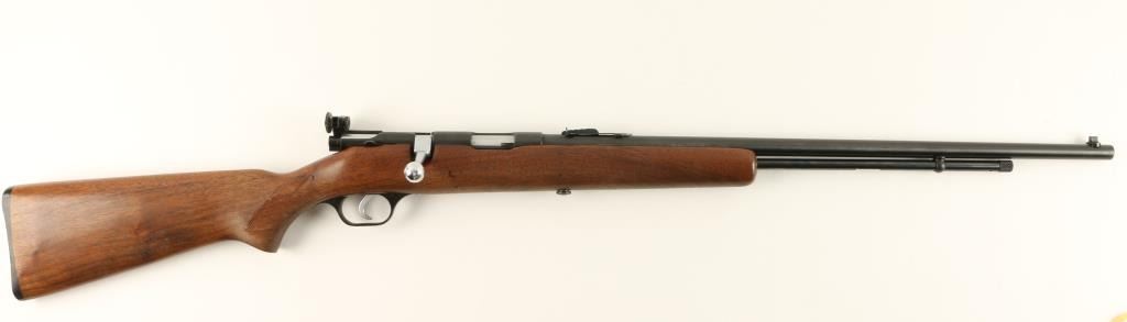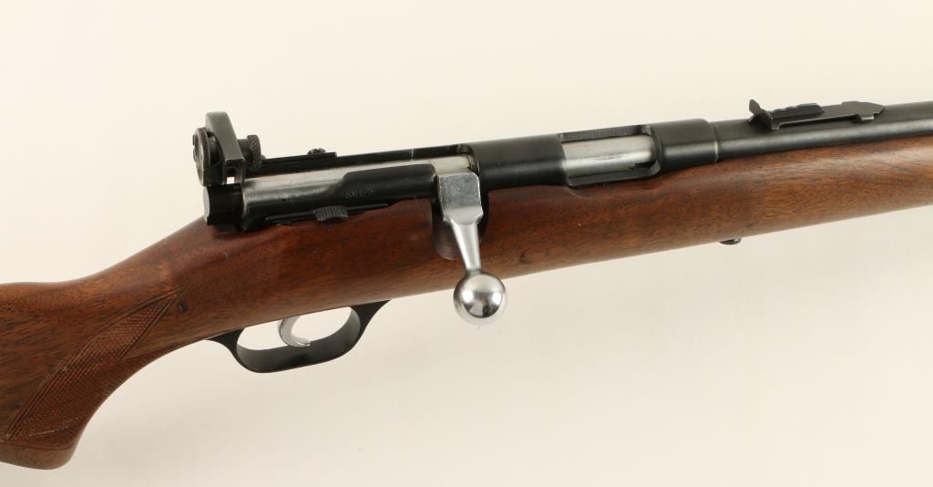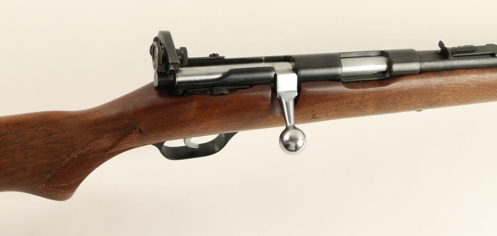 Savage Model 5 bolt action rifle, .22 short, long or LR caliber, 24” round barrel, no visible S/N, blued finish, adjustable receiver mounted peep sight, wood stock in overall very good condition with a very good bore, crisp action, sharpmarkings and very good wood stock displaying after market checkering to the wrist area. (C&R). Est.: $100-$200.