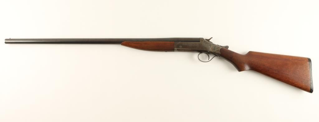 Stevens Arms Company single shot shotgun, 16 gauge, serial # NSNV. The shotgun is in overall good condition with a 28” blued barrel with brass bead front sight. The barrel retains the majority of its blued finish while the receiver has goneprimarily to patina. The smooth wood stocks are in overall good condition with small mars and finish loss consistent with field use. The butt stock ends with a hard rubber, Stevens marked butt plate and a 14 1/4” LOP. The bore is very good,the action crisp and markings are legible. (C+R) Est.: $100-$200.