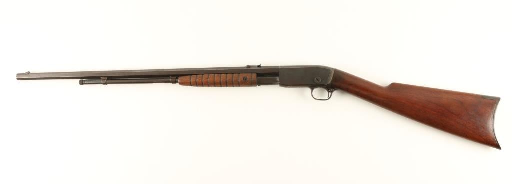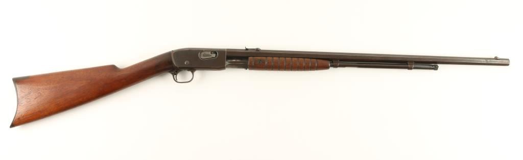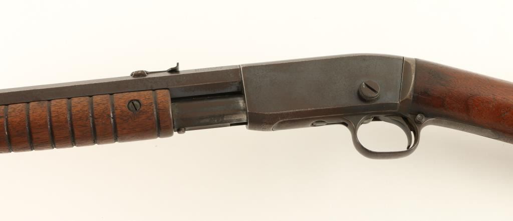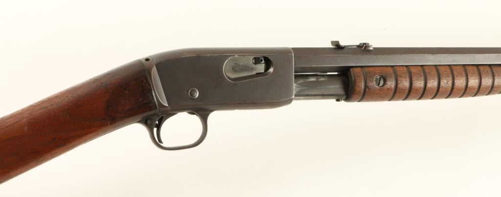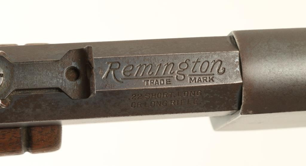 Remington pump action rifle, .22 short, long or LR caliber, 24” octagon barrel, S/N 183171, dark brown patina, wood stocks in overall good condition displaying a dark patina on metal surfaces with some faint areas of original blue;good rifling, good action, markings and wood. (C&R). Est.: $150-$300.
