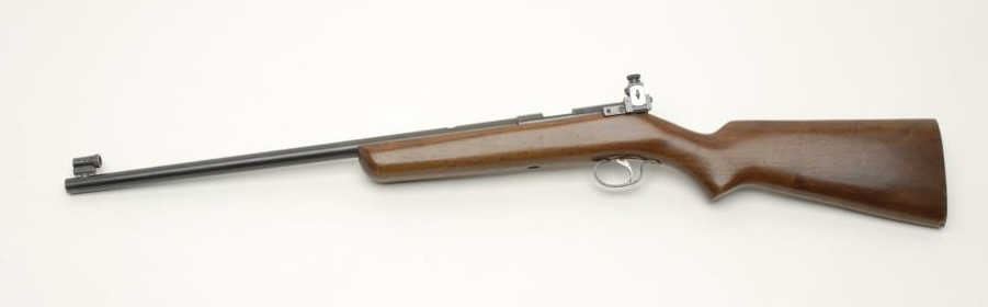 Winchester Model 47 Bolt Action Rifle, .22 S,L,LR, 20” barrel, blue finish, pistol grip stock, NSNV. This rifle remains in good condition showing majority of its thinning blue finish remaining. The barrel has been reduced and Lyman targetsights have been added. The stock appears to be a replacement and cut down for use by a child. The name Newton is marked on the right side of the receiver. The action does not work and the bore is very good. (C&R) Est.: $150-$300