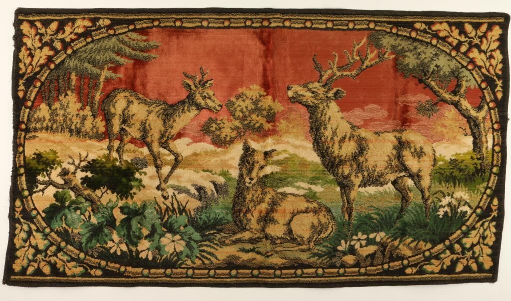 Elk tapestry and a multi-color table cloth; both from an old estate and both in good condition for age. Est.: $150-$300.