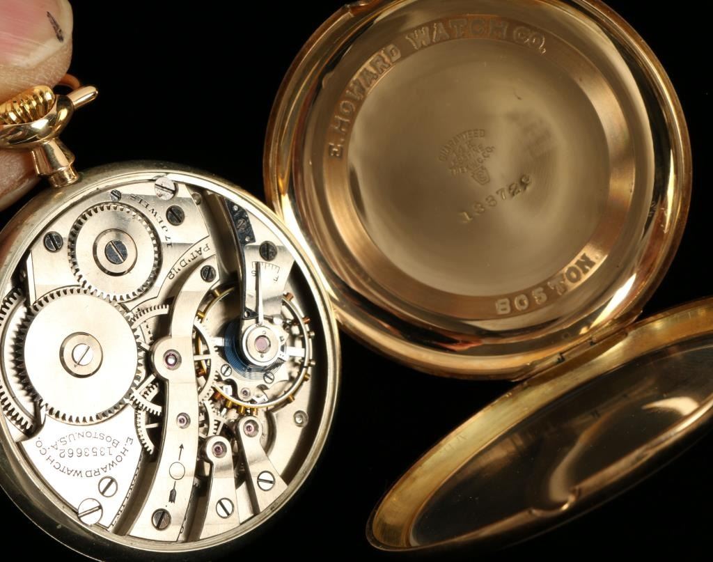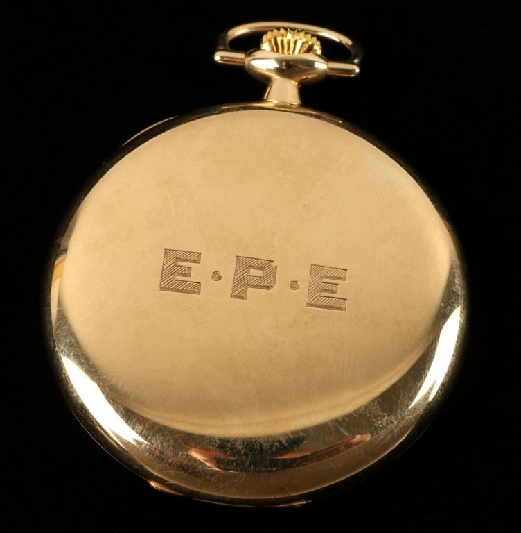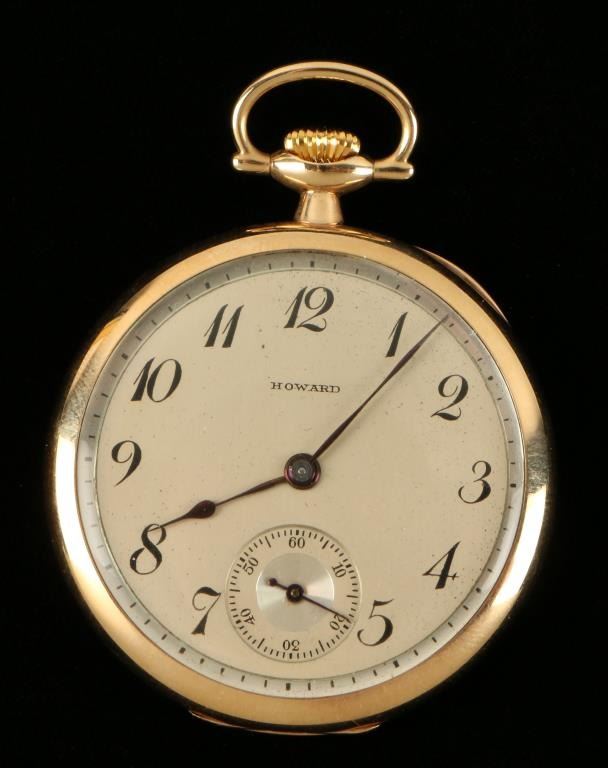 Howard open face pocket watch, approximately 1.75” in diameter, “EPE” engraved on back cover; running at time of description. Est.: $400-$800.