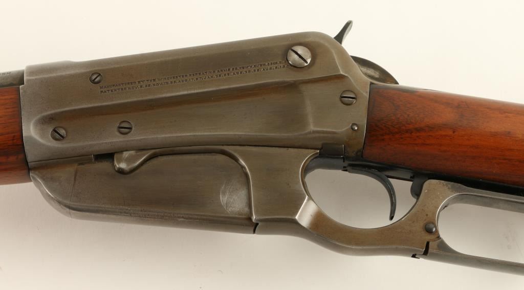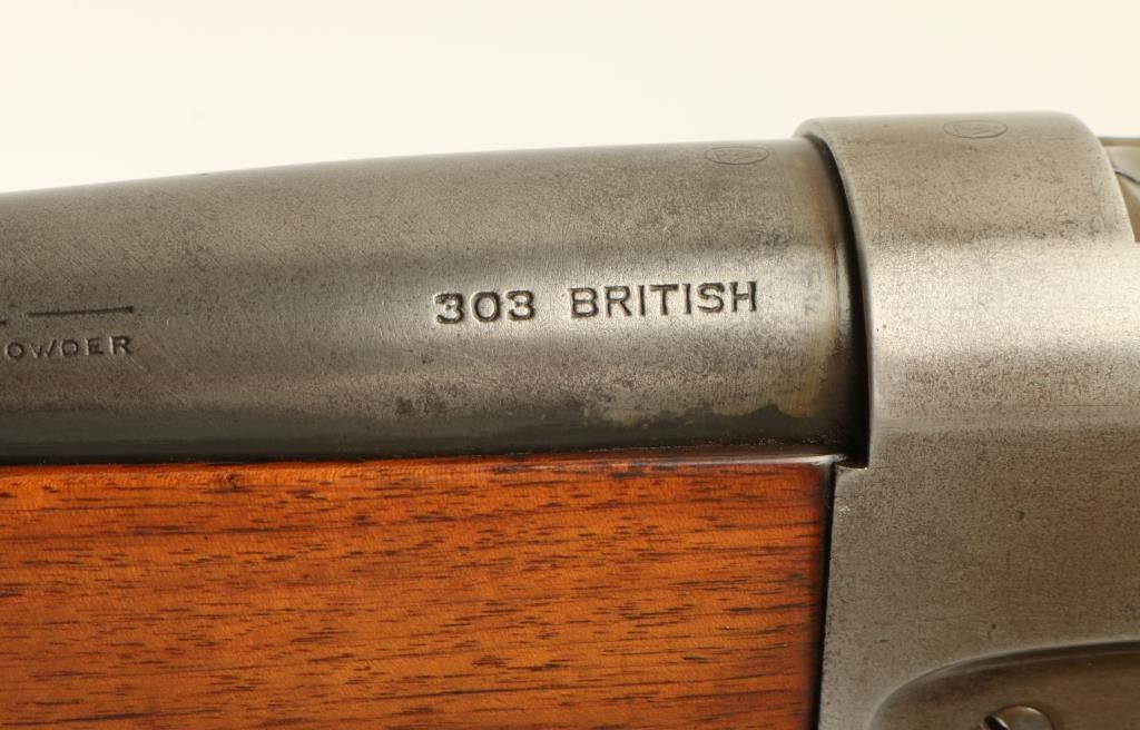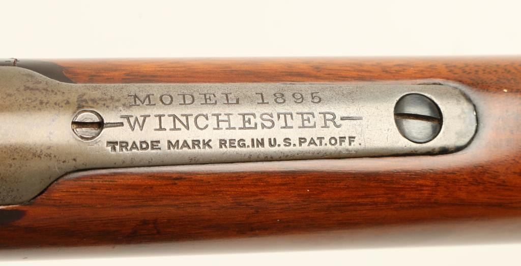 Winchester Model 1895 lever action rifle, .303 British caliber, 28” round barrel, S/N 68602, blued finish, wood stocks in overall very good condition showing areas of muted blue finish on the barrel, grey patina to the receiver, very good bore, crisp action, sharp markings and very good wood that shows the original ebony insert at the front end of the forend; small areas of oil staining on either side of the upper tang. (C&R). Est.: $700-$1,400.