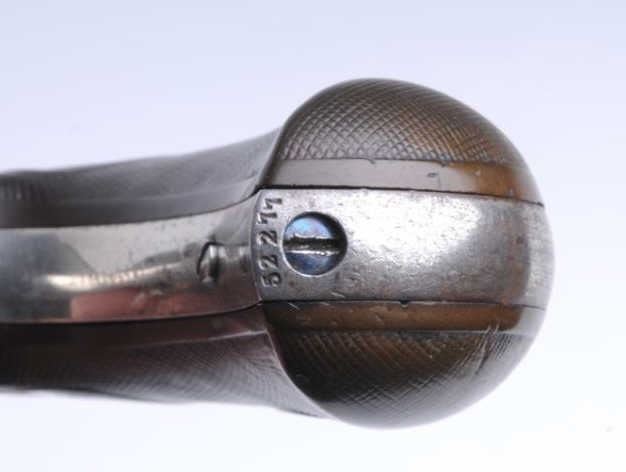 Colt Model 1877 ejectorless DA Lightning revolver, .38 caliber, 3.5” barrel, nickel finish, etched panel, checkered black hard rubber grips, S/N 52277 (all matching visible numbers), in overall very good to fine condition showing the majorityof its original nickel finish and majority of its original etched panel on the left side of the barrel; some minor spots of erosion, considerable original niter blue on hammer and trigger; crisp action at time of description, sharp markings andvery good grips; very good to fine bore. (Antique). Est.: $800-$1,600.