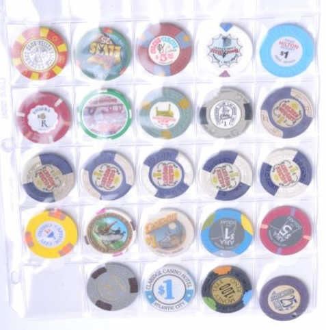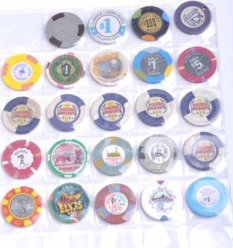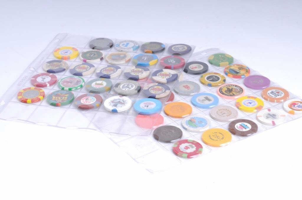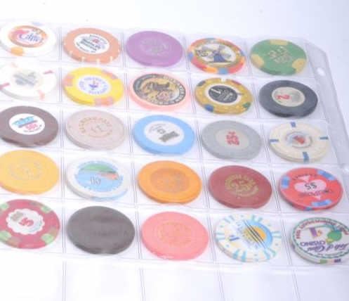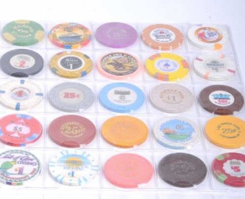 Lot of 49 collector casino chips ranging from 25 cent chips to $100 chip; many different locations; lots of Las Vegas casino chips, varying ages and construction materials; a neat grouping with some hard-to-find chips included. Est.: $150-$300.