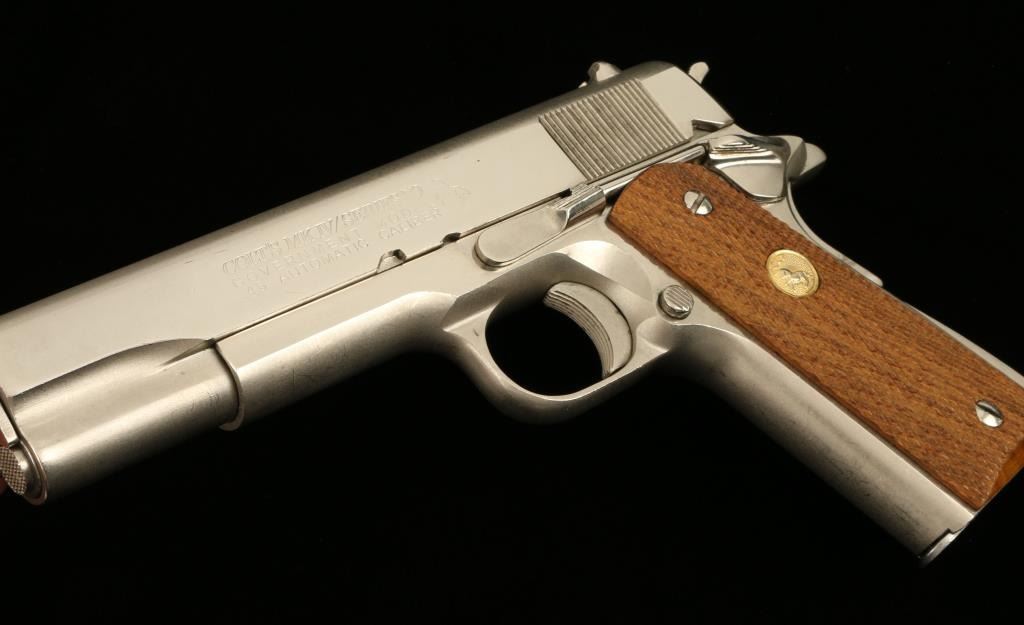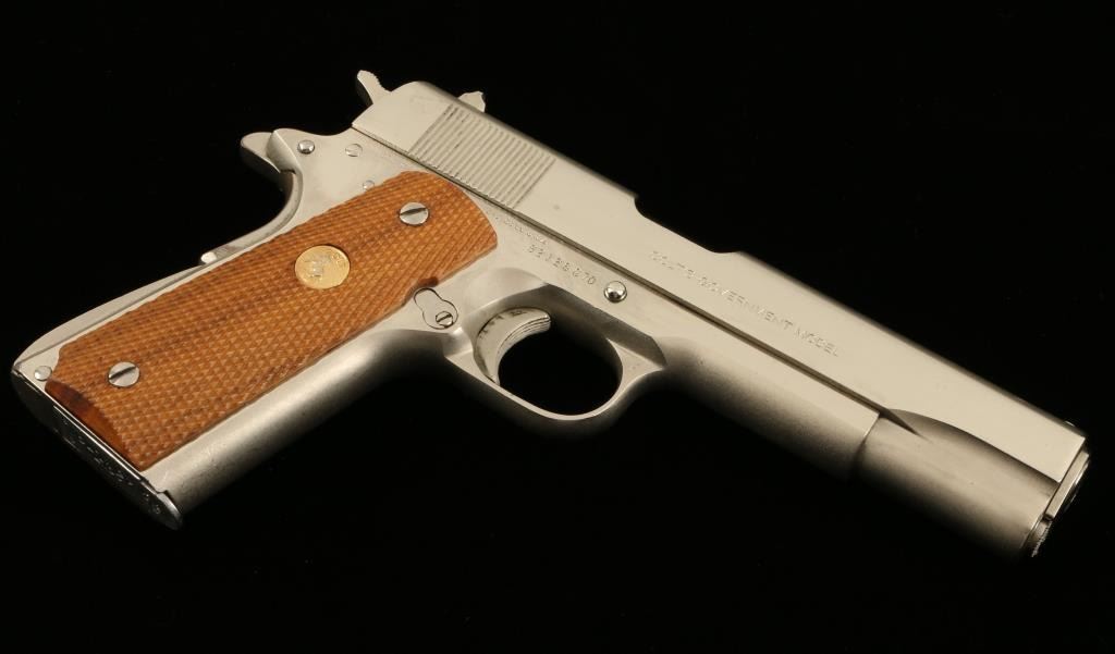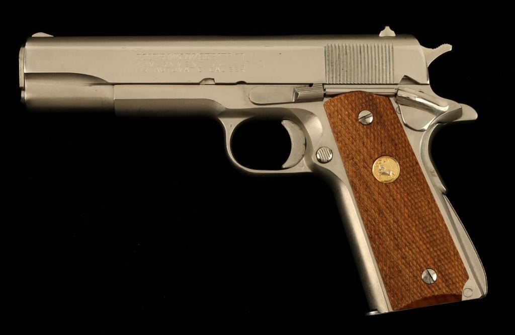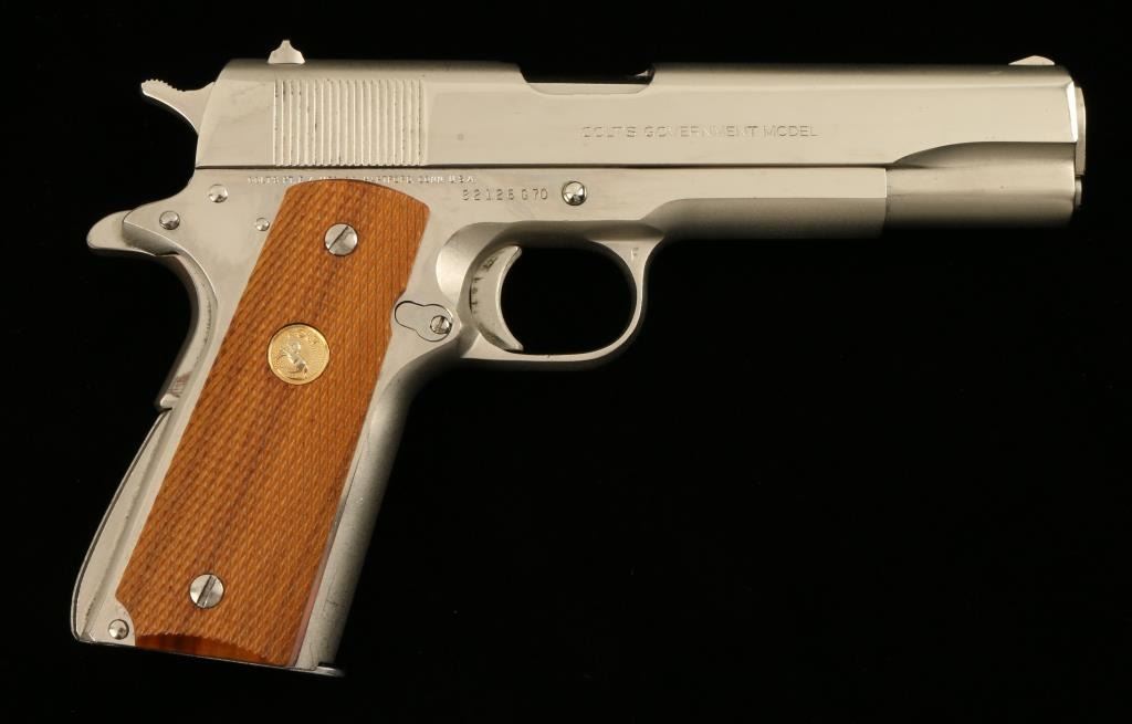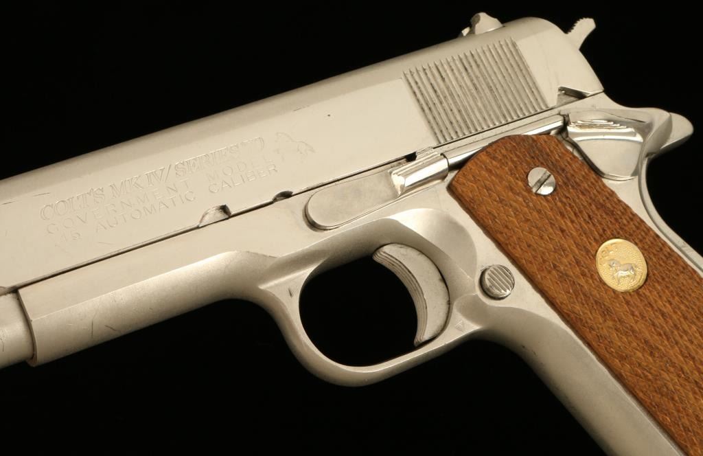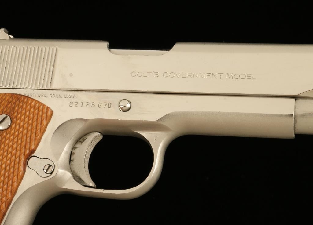 Colt Mark IV/Series 70 Government Model semi-automatic pistol, .45 caliber, 5” barrel, S/N 82126G70, desirable factory nickel finish, checkered wood gold medallion grips in overall fine condition showing the majority of itsoriginal finish, fine bore, action, markings and grips. (NO CALIF. SALE EXCEPT TO FFL HOLDER). Est.: $1,250-$2,500.