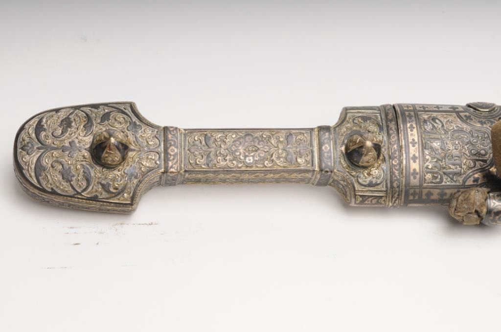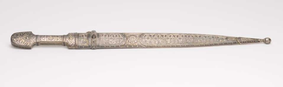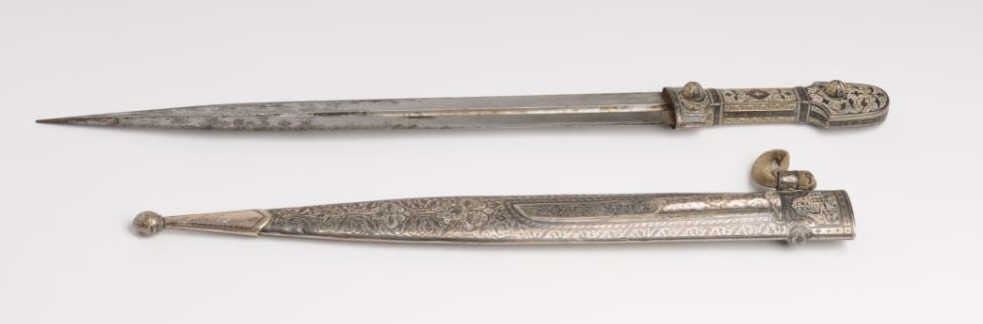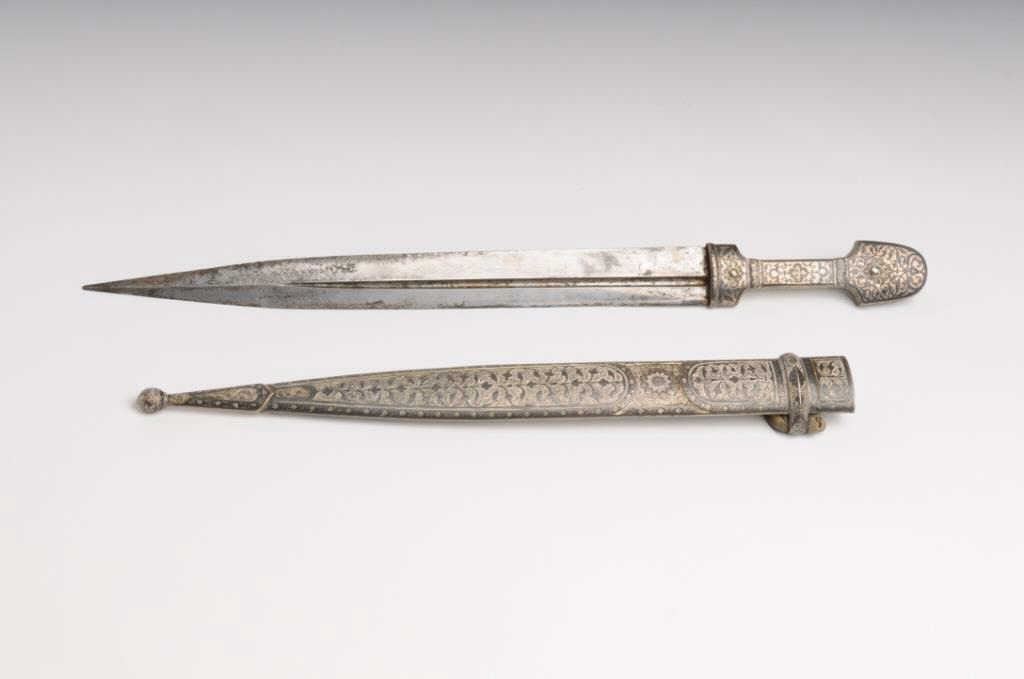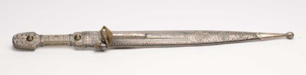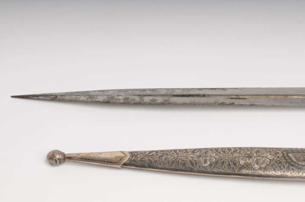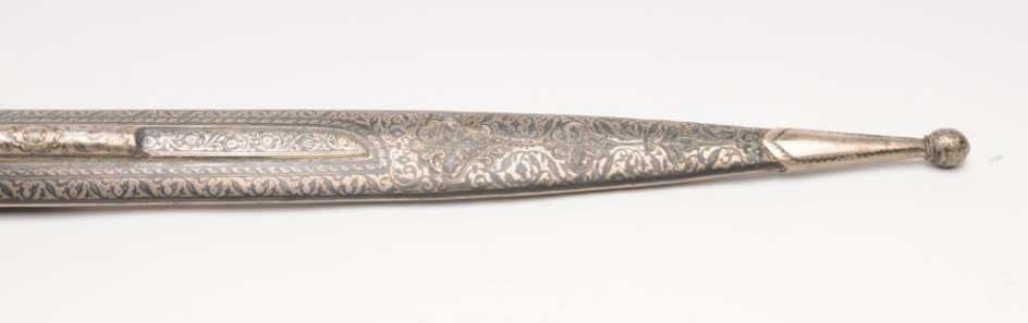 Russian Kenjal signed in Cyrillic writing at the top of the scabbard and dated 1887. Measures 22 ½” overall with 14 ¾” English style steel blade. Fine silver work and in good condition. An estate piece and genuine antique not a current copy.Est.: $1500-$3000