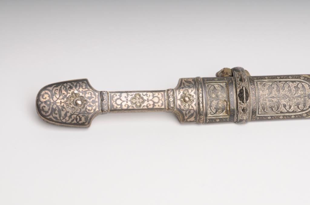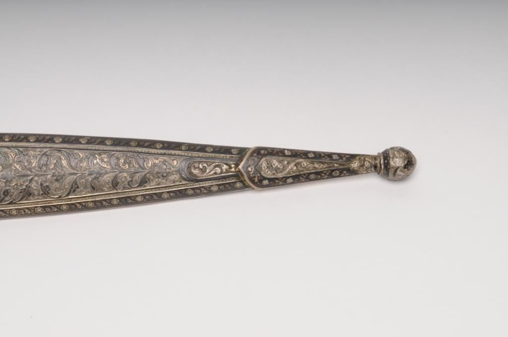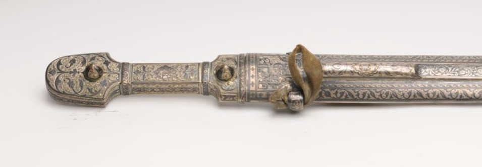 Lot 121a Russian Kenjal signed in Cyrillic writing at the top of the scabbard and dated 1887. Measures 22 ½”