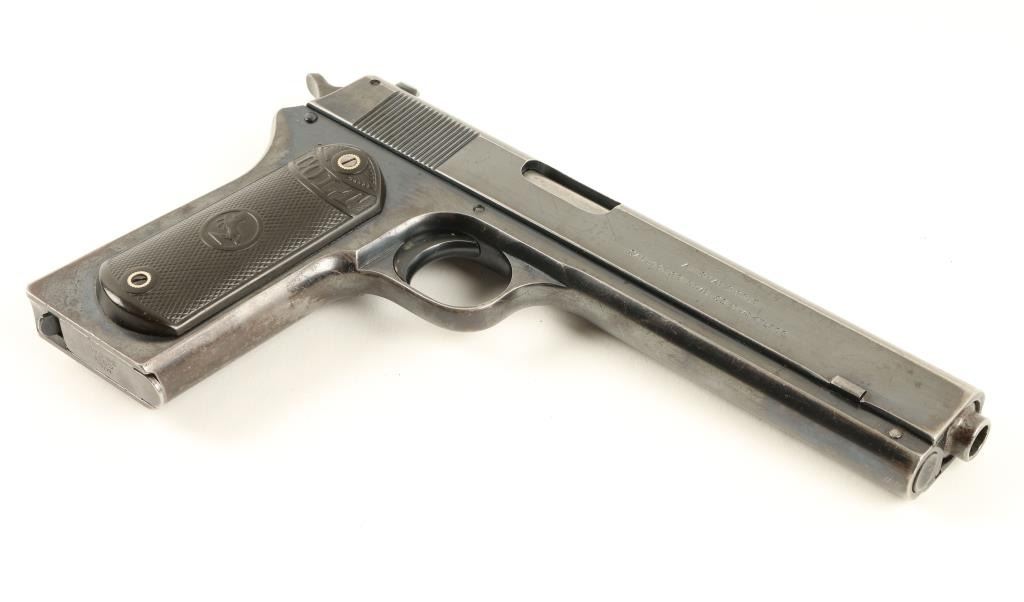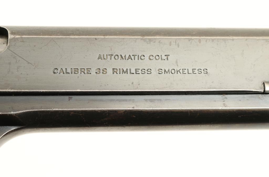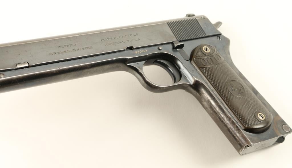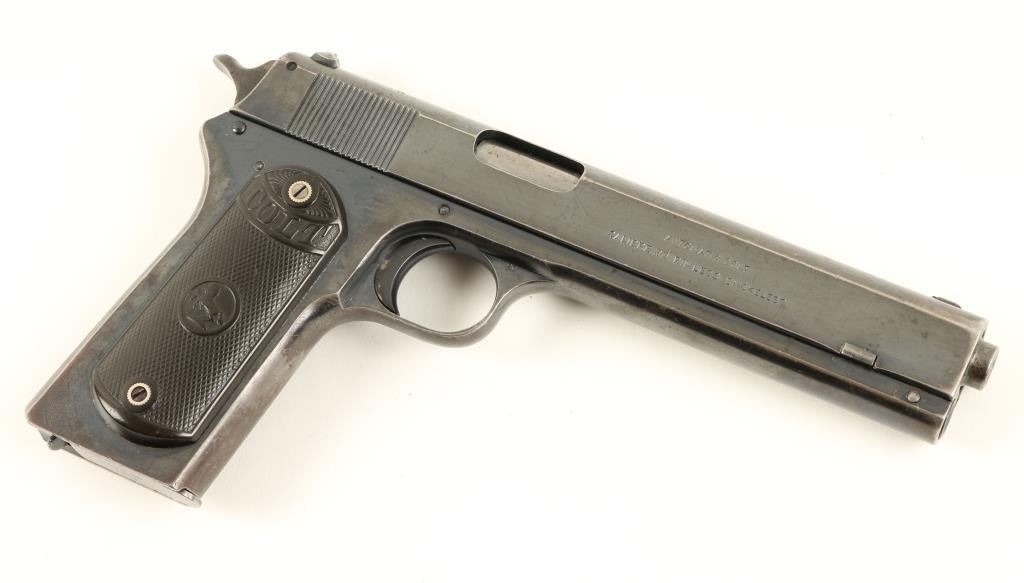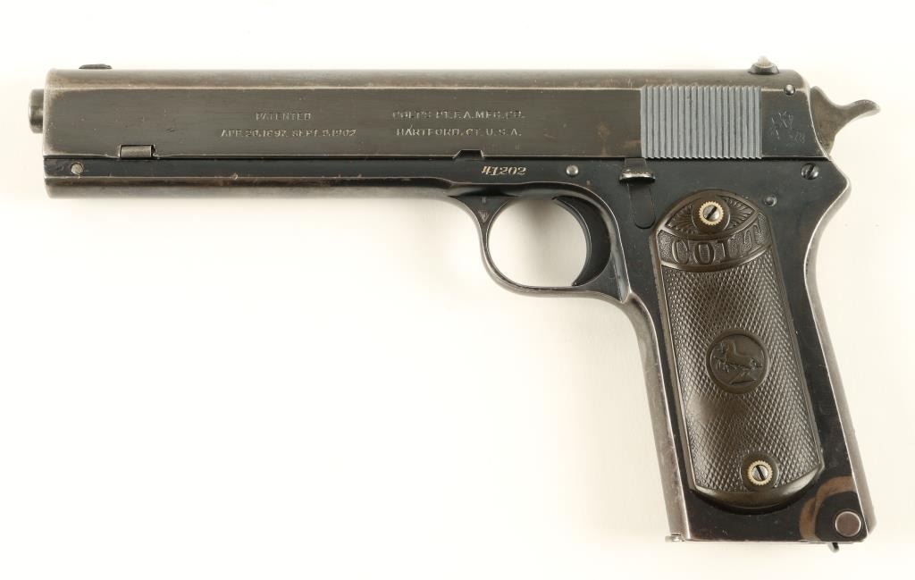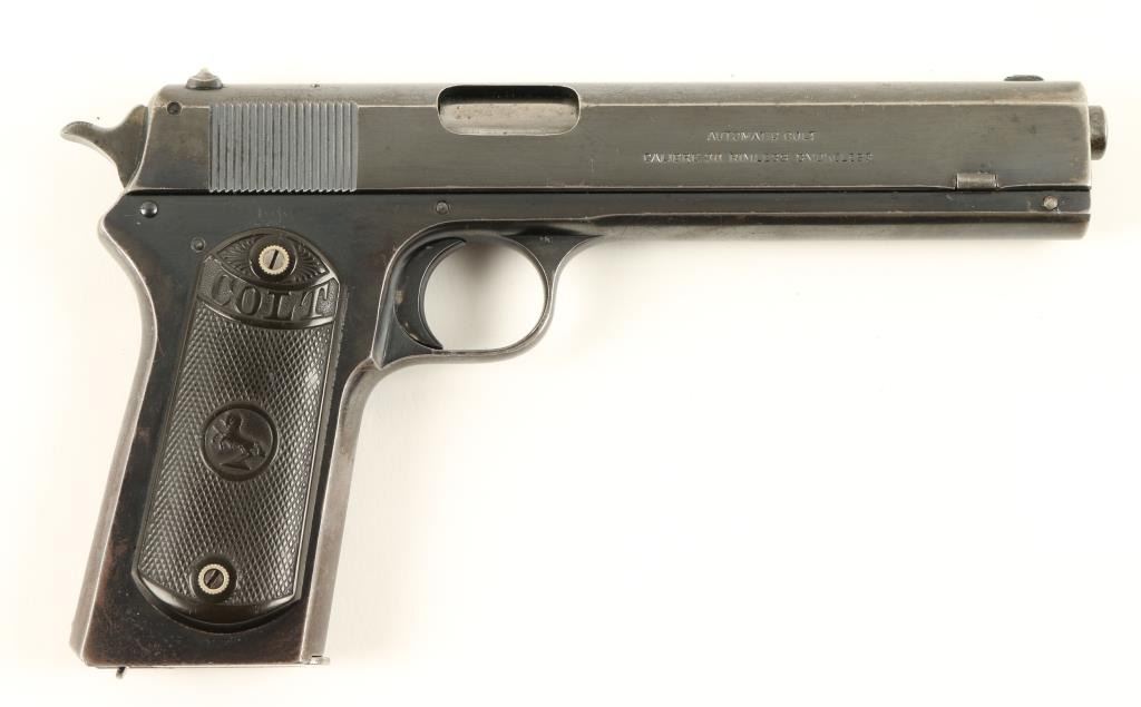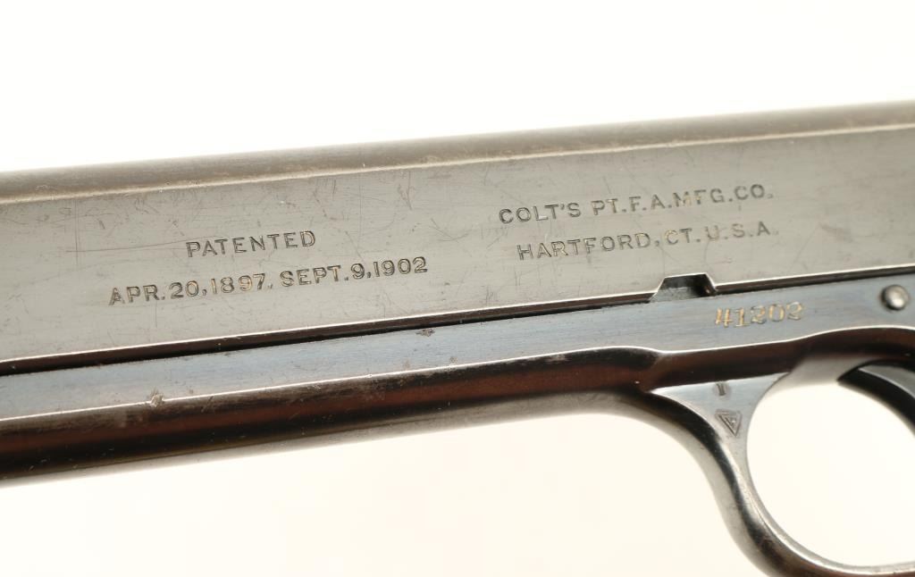 Colt Model 1902 Military semi-automatic pistol, .38 rimless auto caliber, 6” barrel, S/N 41202, blued finish, checkered hard rubber grips in overall very good + condition displaying the majority of its original finish, crisp action,sharp markings, near fine bore and very good grips; magazine marked “MIL COLT CAL 38” on floor plate; lanyard ring has been modified. Accompanied by a Colt factory letter confirming features; Type of Stocks “Not Listed”; shipped onJanuary 21, 1921 to Janney, Semple, Hill and Co., Minneapolis, Minnesota with 7 guns in shipment. (C&R/PPT). Est.: $1,250-$2,500.