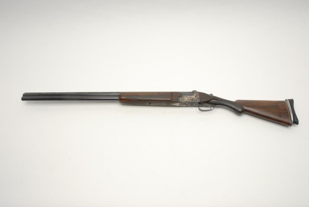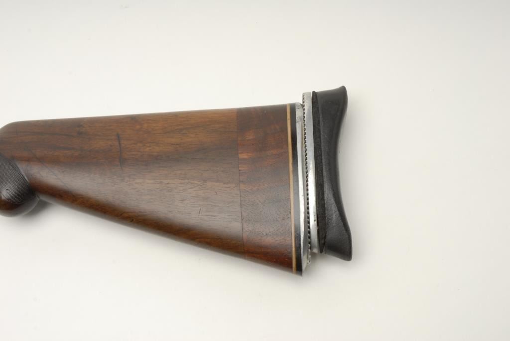 Early Belgian O/U trap gun in 12GA marked “L. Le Personne & Co., LTD., London”, 32” barrels, Miller single trigger, auto ejectors, adjustable butt plate and rubber pad, Choked improved mod over modified, classic European lines and floralengraving, checkered stocks with split fore end, Belgium proofs for 2 ¾” shells and we would date 1948-1960s. The condition is near fine as refinished with 98% remaining. The wood shows normal use and the stock has been lengthen for atall man. Measures 13 ¼” to the end of the wood and 14 ½” to the end of the rubber pad. A quality European arm made for import to London where it competed with the world’s best makers at their prime. (C&R) Est.: $1400-$2800