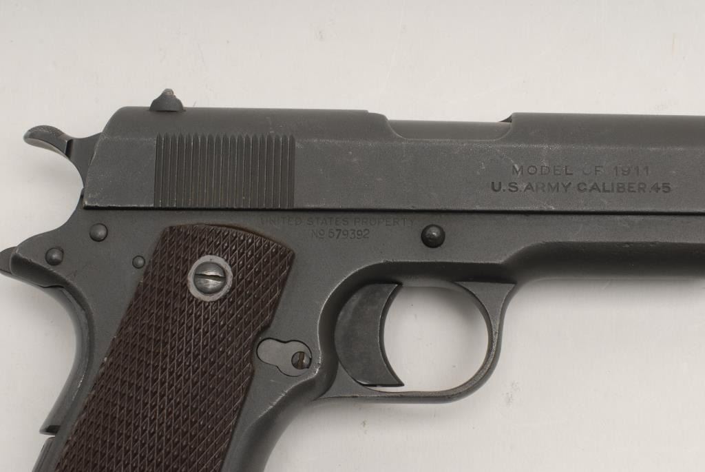 U.S. Property Model 1911 semi-automatic pistol by Remington-UMC, .45 caliber, 5” barrel, arsenal rebuilt by Augusta Arsenal, S/N 579392, military parkerized finish, checkered brown grips in overall very good to near fine condition asrebuilt; crisp action, sharp markings, good bore and near fine grips. (C&R/PPT). Est.: $1,500-$3,000.