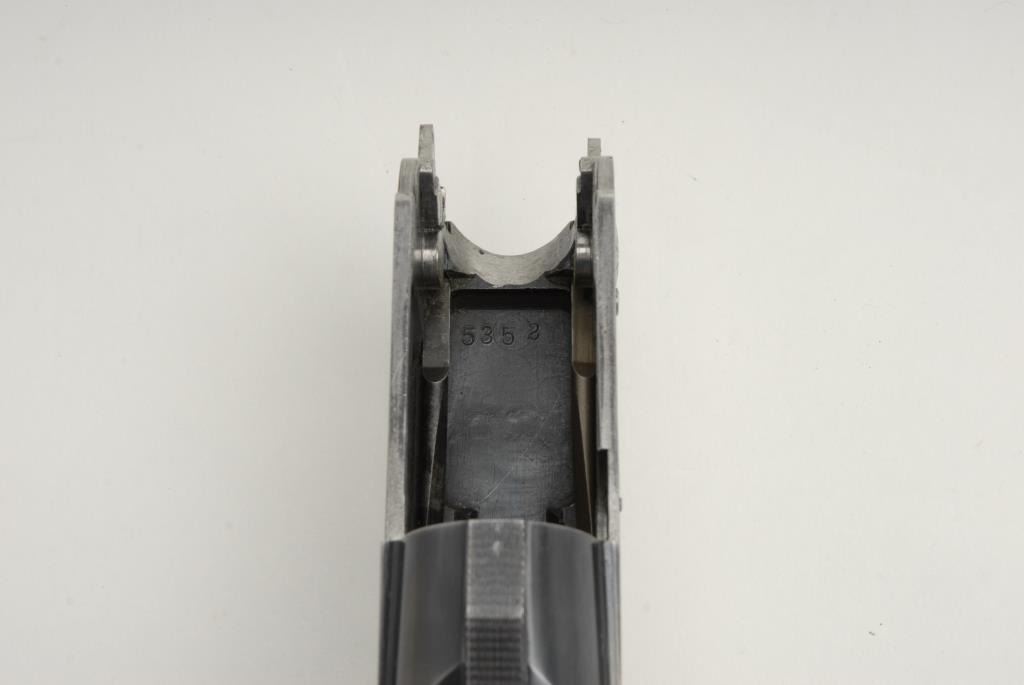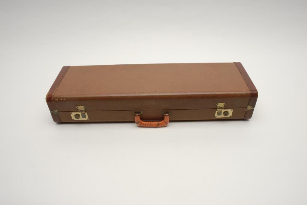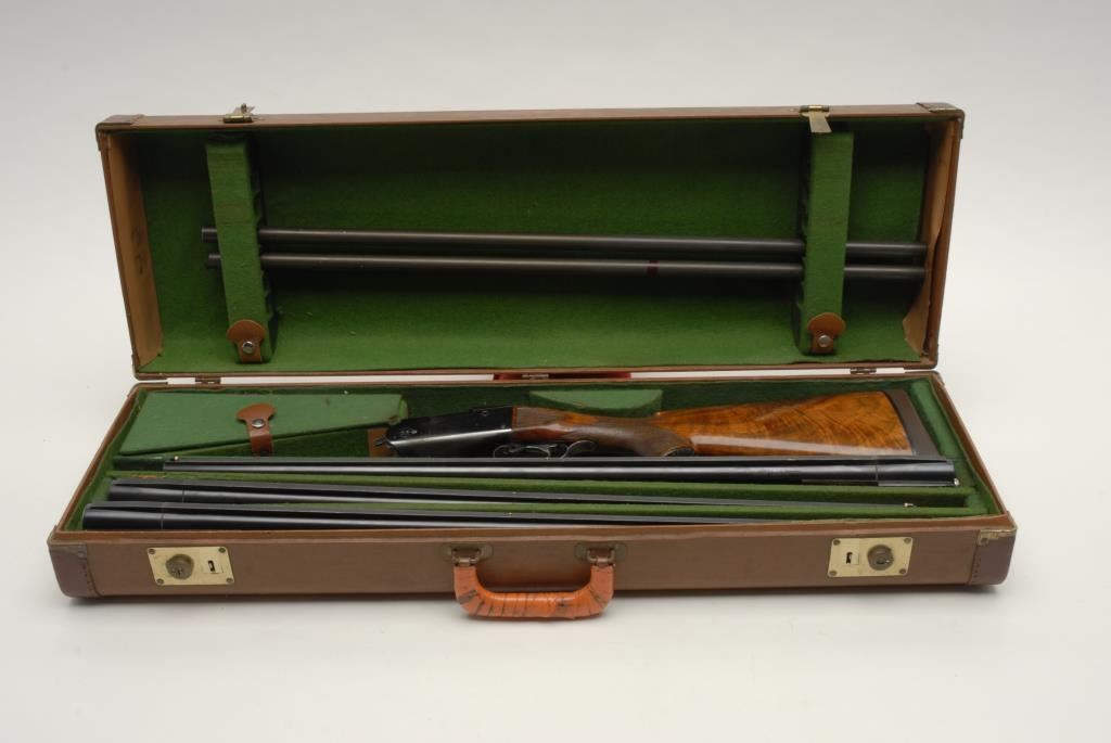 Early Krieghoff “Kerr’s Special” Model 32 O/U 20 GA magnum shotgun, S/N 5352 with 3 barrels, luggage case, tools, and two sets of tubes for smaller gauges. The gun shows upgraded wood and all barrels are numbered to match. The stockmeasures 13 ¼” to the end of the wood and 14 ¼” to the end of the pad. The bottom of the frame is marked Kerr’s who were top of the line retailers of fine arms on Wilshire Blvd in Beverly Hills. Kerr’s serviced the movie stars and sportsmen ofthe 50s to 70s. The gun shows blue wear at the bottom of the frame and use but is very good overall with most of the original finish on the barrels and 50% on the frame remains. Checkering worn but good wood. Est.: $4,000-$8,000