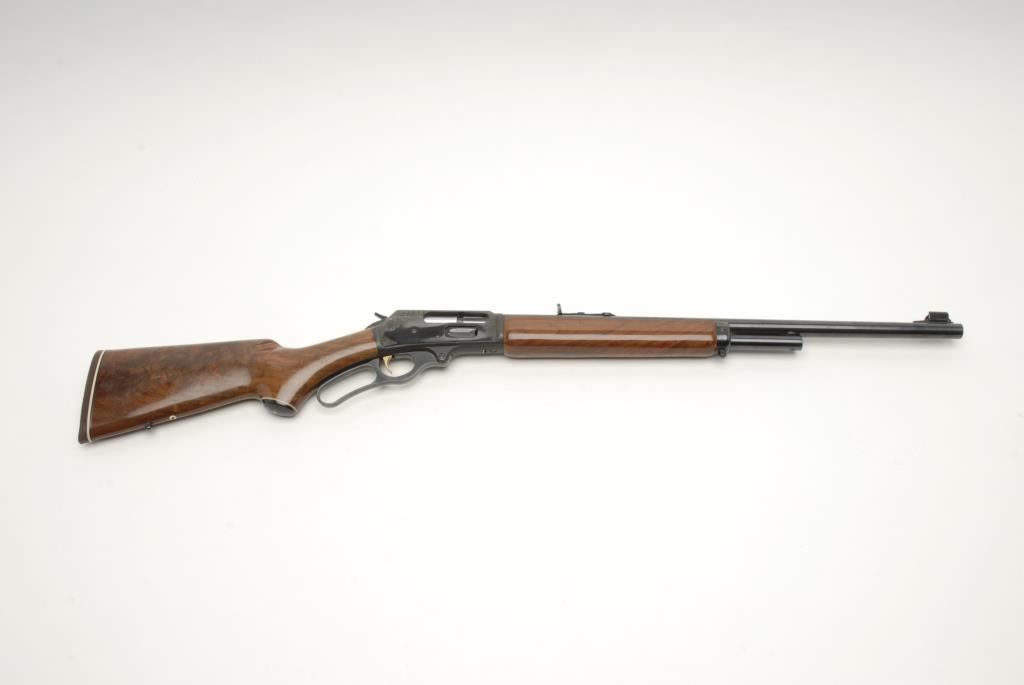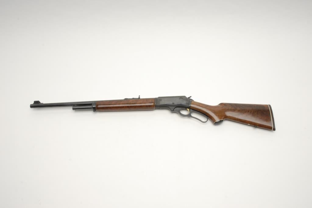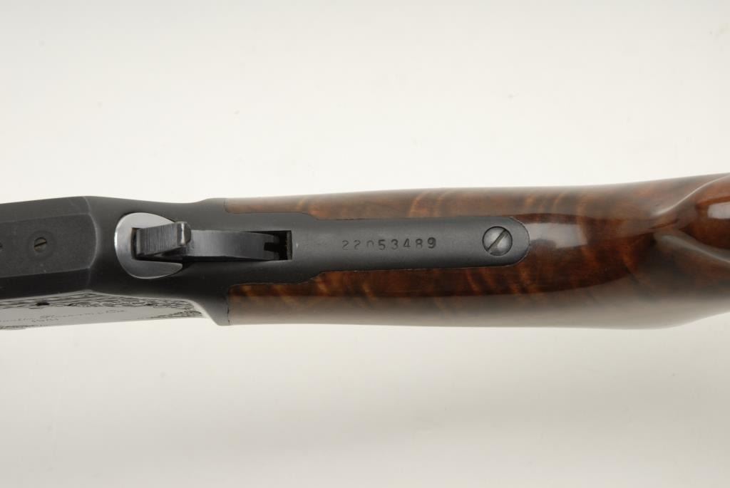 Factory engraved and presentation inscribed Marlin Model 1895 lever action rifle in .45-70 Gov. caliber, S/N 22053489. The left side of the receiver is inscribed “Presented to Ivan Hart by the Marlin Firearms Co., 1981”. This rifle isstocked in deluxe burl wood by the factory and the receiver is nicely scroll engraved signed with fancy “R” initial. Ivan Hart received this rifle for his best of show winning display at the Sahara Antique Arms Show in 1981. Hart was the iconiccollector of lever actions in the west during the 50s to the 1990s. This rifle was gifted to his friend Evy Morgan who kept it until his entering to a convalescent home. Est.: $1,500-$3,000