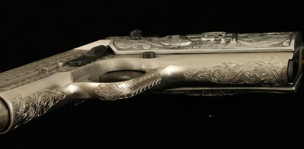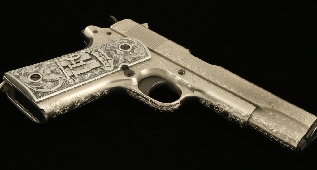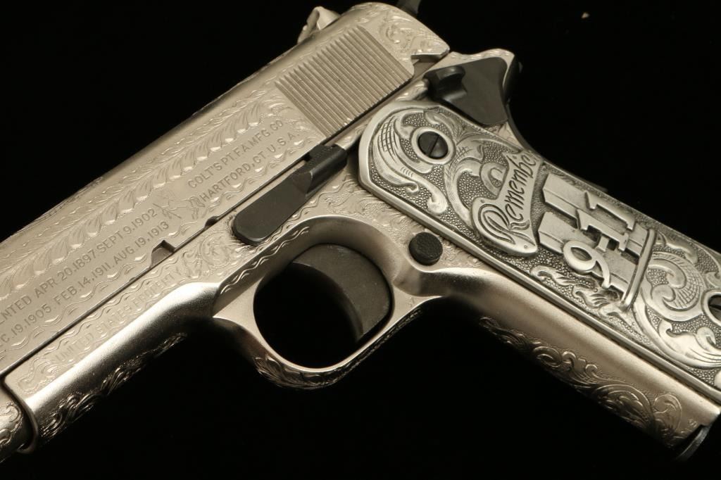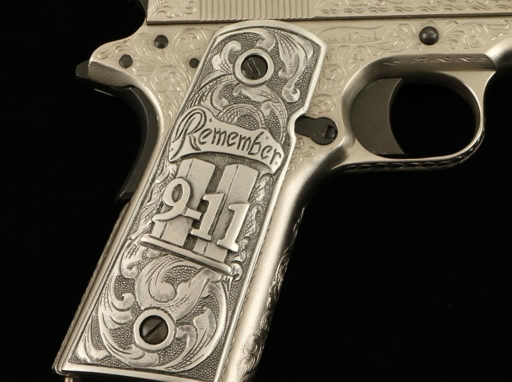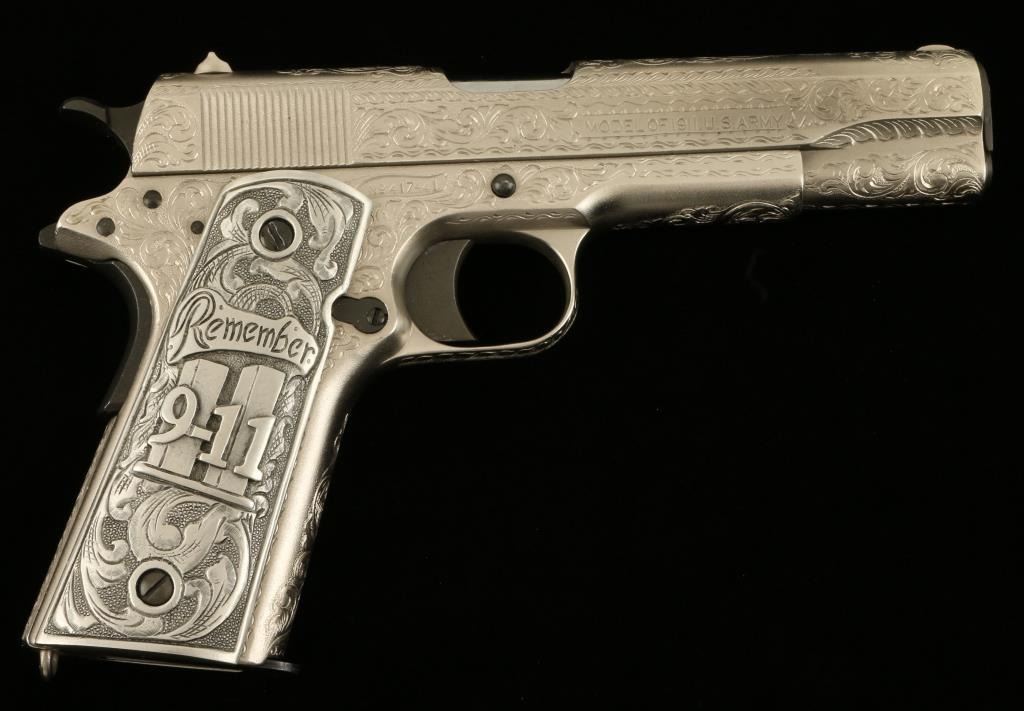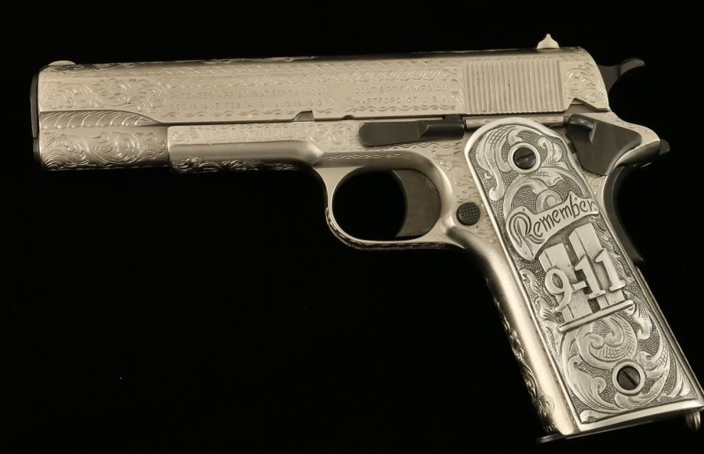 Colt Model 1911 U.S. Property marked semi-automatic pistol, custom engraved by modern engraving master John J. Adams, Sr., .45 caliber, 5” barrel, S/N 417441 with special grips cast of pewter and in commemoration of Remembering 9-11.This beautifully accomplished piece of firearms artistry was custom made for a prominent Colt Collector’s Association member and is a one-of-a-kind object. The gun is accompanied by an authentication letter hand signed by Mr. Adamsconfirming caliber, unique “C” grade coverage and also mentions the custom Adams cast grips; overall fine condition as customized with a crisp action, fine bore, sharp markings and outstanding scroll engraving. (C&R). Est.: $2,500-$5,000.