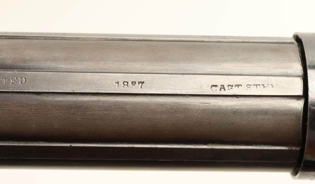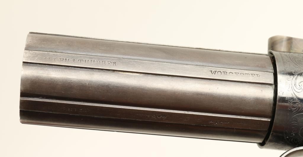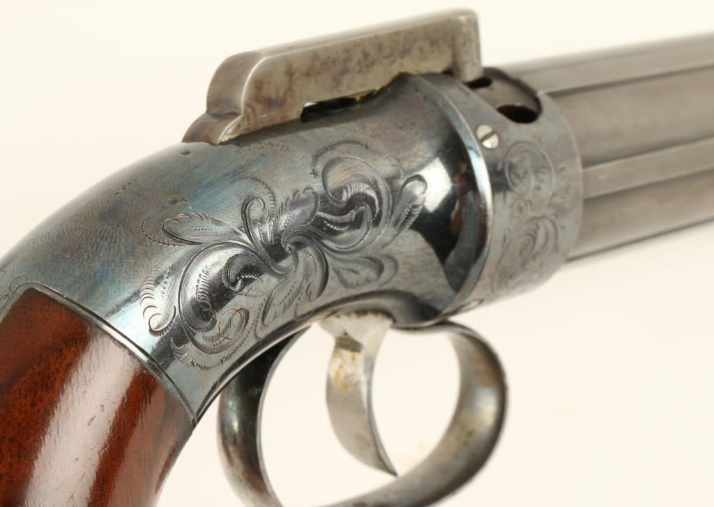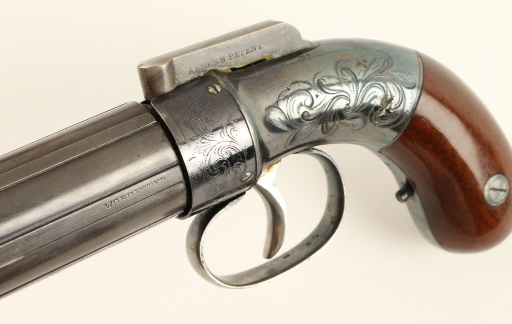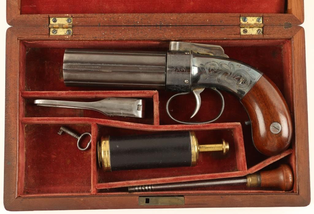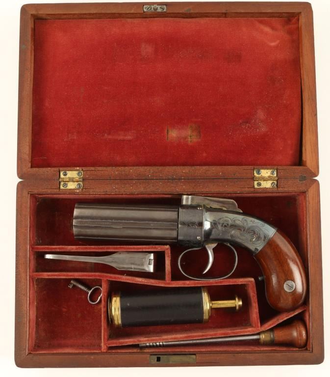 Allen’s patent pepperbox in .31 caliber percussion, 6 shot, remaining in excellent original condition and cased with accessories. This impeccable pistol shows Allen & Thurber marking and Worchester, Mass on the barrels. Theframe shows 90%-95% bright high polish original blue finish as does the recoil shield. The grips are excellent. The hammer shows most of its original case colors. The barrels show 95% original mat blue finish which was less highlypolished. The case is also near fine in a partition style with wine colored velveteen showing only slight fading and impressions. An excellent leather covered pepperbox flask (Often found with Patersons) is included along with,mold, rod, and key. The box is near fine as is the exterior. Only slight handling and minor aging. A strong 9.5 on a 1-10 scale that would be very difficult to improve upon. If it was a coin it would be a MS64-65. (Antique) Est.: $3500-$7000